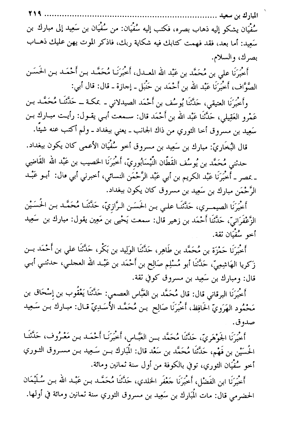 وأخبرنا العتيقي، حدّثنا يوسف بن أحمد الصيدلاني- بمكة- حدّثنا محمّد بن عمرو العقيلي، حَدَّثَنَا عبد اللَّه بْن أَحْمَد قَالَ: سمعت أبي يقول: رأيت مبارك بن سعيد بن مسروق أخا الثوري من ذاك الجانب- يعني ببغداد- ولم أكتب عنه شيئا.