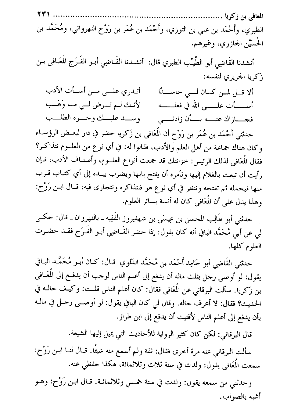 أنشدنا القاضي أَبُو الطيب الطبري قَالَ: أنشدنا الْقَاضِي أَبُو الْفَرَجِ الْمُعَافَى بْنُ زَكَرِيَّا الْجَرِيرِيُّ لنفسه: