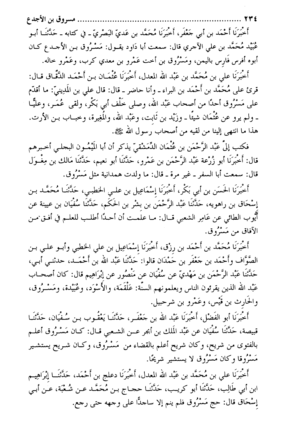 أخبرنا الحسن بن أبي بكر، أخبرنا إسماعيل بن علي الخطبي، حدّثنا محمّد بن إسحاق بن راهويه، حَدَّثَنَا عَبْدُ الرَّحْمَنِ بْنُ بِشْرِ بْنِ الْحَكَمِ، حَدَّثَنَا سفيان بن عيينة عن أيوب الطائي عن عَامِر الشعبي قال: ما علمت أن أحدا أطلب للعلم في أفق من الآفاق من مسروق.