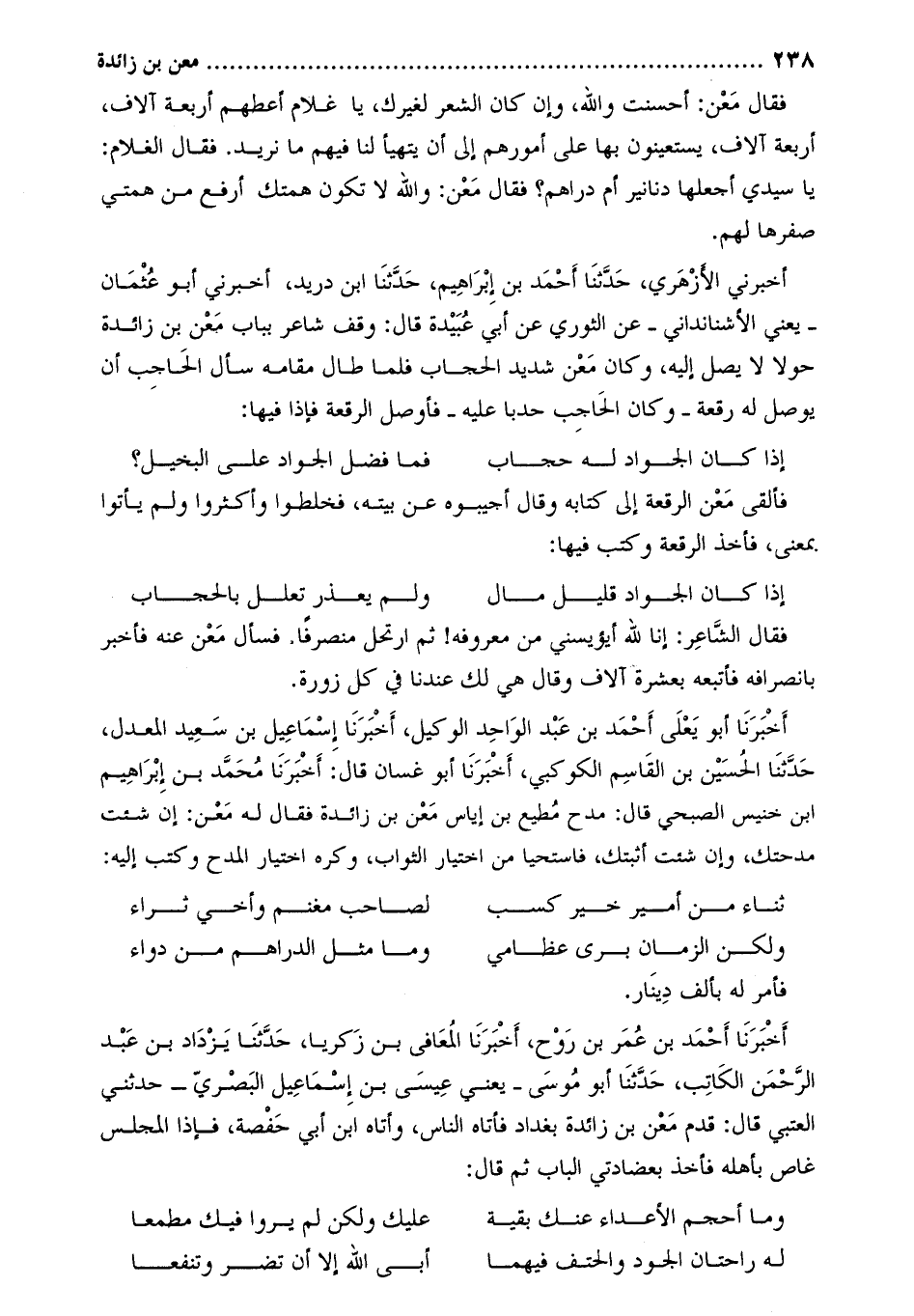 أخبرني الأزهري، حدّثنا أحمد بن إبراهيم، حدّثنا ابن دريد، أخبرني أَبُو عثمان- يعني الأشنانداني- عن الثوري عن أبي عبيدة قال: وقف شاعر بباب معن بن زائدة حولا لا يصل إليه، وكان معن شديد الحجاب فلما طال مقامه سأل الحاجب أن يوصل له رقعة- وكان الحاجب حدبا عليه- فأوصل الرقعة فإذا فيها:
