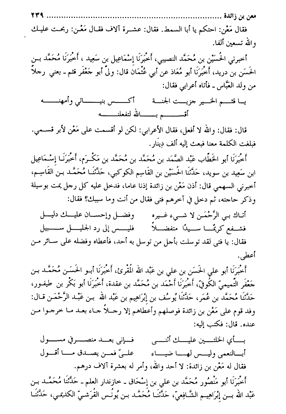 أَخْبَرَنَا أَبُو الْخَطَّابِ عَبْدُ الصَّمَدِ بْنُ مُحَمَّدِ بن مُحَمَّد بن مكرم، أخبرنا إسماعيل ابن سعيد بن سويد، حدّثنا الحسين بن القاسم الكوكبي، حدّثنا محمّد بن القاسم، أَخْبَرَنِي السهمي قال: أذن معن بن زائدة إذنا عاما، فدخل عليه كل رجل يمت بوسيلة وذكر حاجته، ثم دخل في آخرهم فتى فقال من أنت وما سببك؟ فقال: