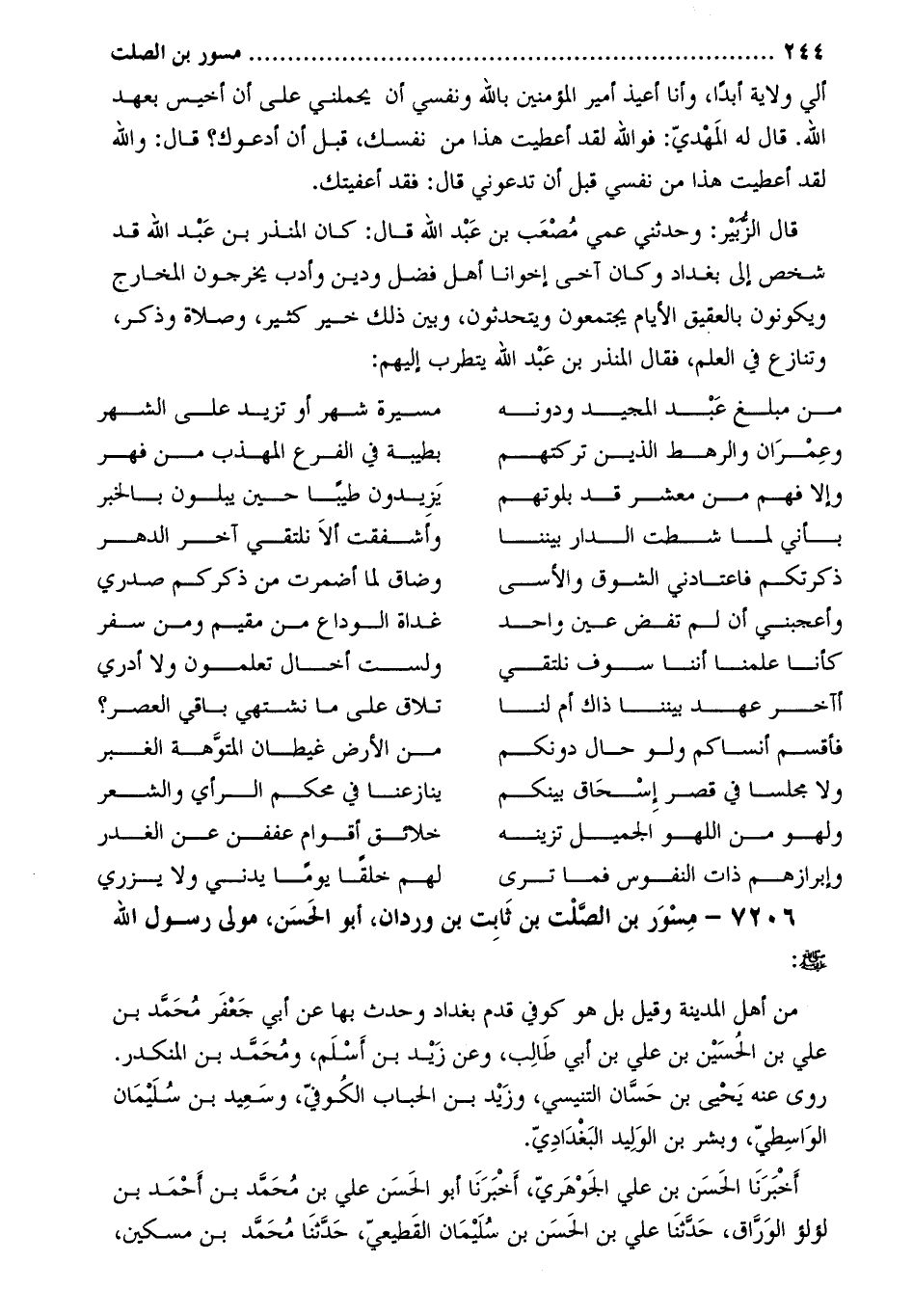 قَالَ الزبير: وحَدَّثَنِي عمي مصعب بن عبد اللَّه قَالَ: كان المنذر بن عبد الله قد شخص إلى بغداد وكان آخى إخوانا أهل فضل ودين وأدب يخرجون المخارج ويكونون بالعقيق الأيام يجتمعون ويتحدثون، وبين ذلك خير كثير، وصلاة وذكر، وتنازع في العلم، فقال المنذر بن عبد الله يتطرب إليهم: