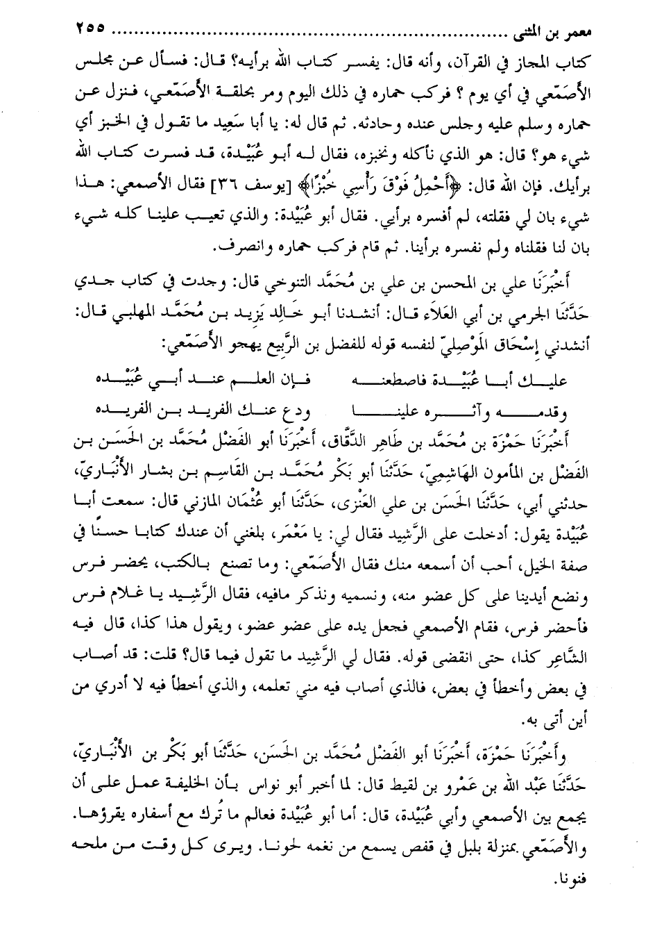 وأخبرنا حمزة، أخبرنا أبو الفضل محمّد بن الحسن، حدّثنا أبو بكر بن الأنباريّ، حَدَّثَنَا عبد الله بن عمرو بن لقيط قال: لما أخبر أَبُو نواس بأن الخليفة عمل على أن يجمع بين الأصمعي وأبي عبيدة، قال: أما أَبُو عبيدة فعالم ما ترك مع أسفاره يقرؤها.