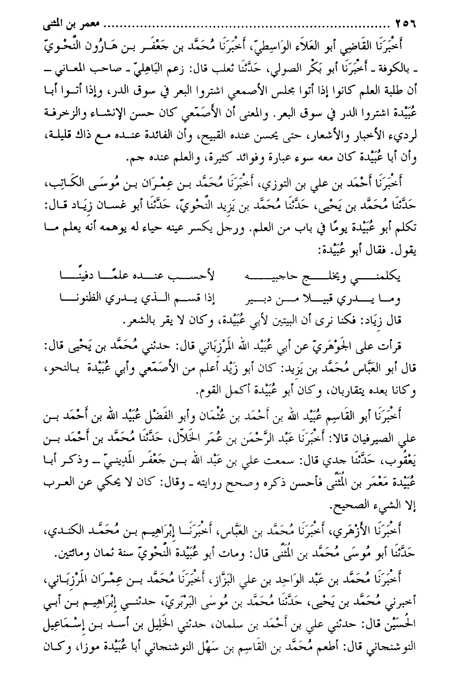 أَخْبَرَنَا أَبُو الْقَاسِمِ عُبَيْدُ اللَّهِ بْن أَحْمَد بن عثمان وأَبُو الْفَضْلِ عُبَيْد اللَّهِ بْنُ أَحْمَدَ بْنِ عَلِيٍّ الصَّيْرَفِيَّانِ قَالا: أَخْبَرَنَا عَبْد الرَّحْمَن بْن عُمَر الخلال، حدّثنا محمّد بن أحمد بن يعقوب، حَدَّثَنَا جَدِّي قَالَ: سَمِعْتُ عَلِيَّ بْنَ عَبْدِ اللَّهِ بْنِ جعفر المديني- وذكر أبا عبيدة معمر بن المثنى فأحسن ذكره وصحح روايته- وقال: كان لا يحكي عن العرب إلا الشيء الصحيح.