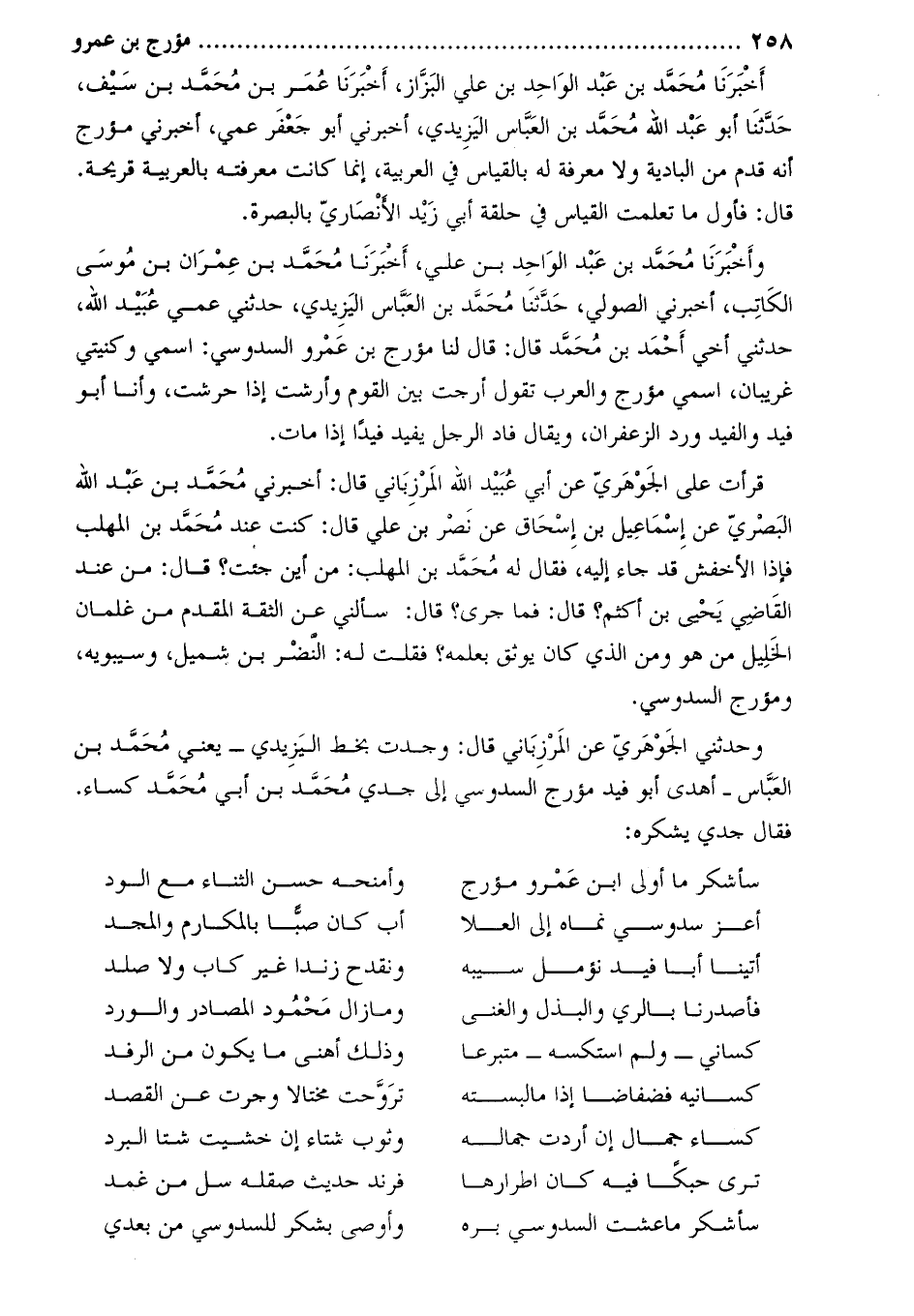 أَخْبَرَنَا مُحَمَّد بْن عبد الواحد بْن علي البزاز، أخبرنا عمر بن محمّد بن سيف، حَدَّثَنَا أَبُو عَبْد اللَّه مُحَمَّد بْن العباس اليزيدي، أخبرني أبو جعفر عمي، أَخْبَرَنِي مؤرج أنه قدم من البادية ولا معرفة له بالقياس في العربية، إنما كانت معرفته بالعربية قريحة.