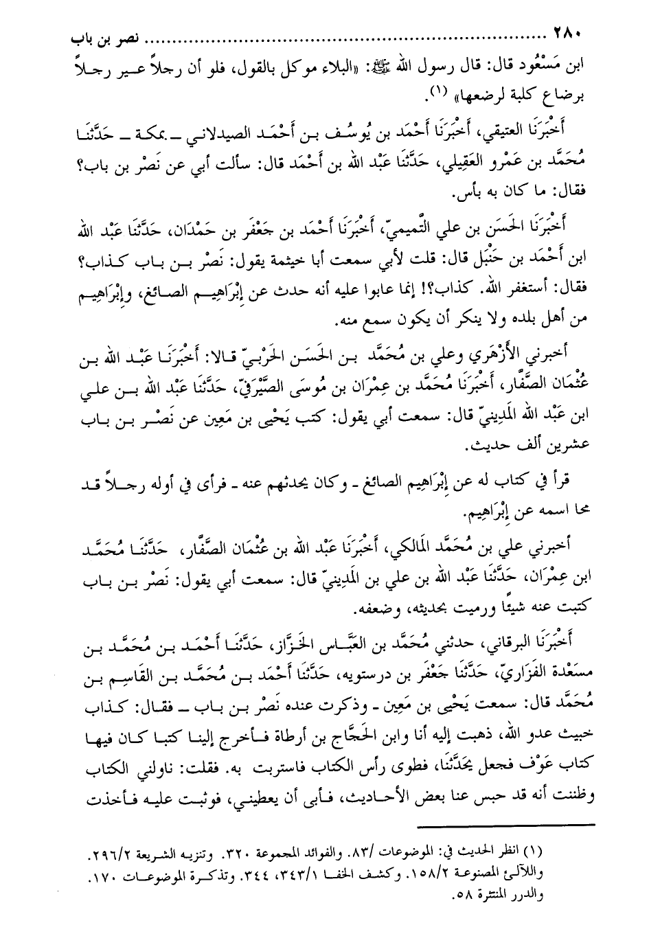 أَخْبَرَنَا العتيقي، أخبرنا أحمد بن يوسف بن أحمد الصيدلاني- بمكة- حدّثنا محمّد بن عمرو العقيلي، حَدَّثَنَا عبد الله بن أحمد قَالَ: سألت أبي عن نصر بن باب؟