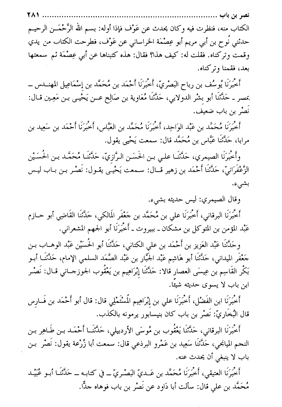 وحَدَّثَنَا عَبْد العزيز بن أَحْمَد بن علي الكتاني، حَدَّثَنَا أَبُو الْحُسَيْنِ عبد الوهاب بن جَعْفَر الميداني، حَدَّثَنَا أَبُو هاشم عَبْد الجبار بْن عَبْد الصّمد السلمي الإمام، حَدَّثَنَا أَبُو بكر القاسم بْن عيسى العصار قالا: حَدَّثَنَا إبراهيم بن يعقوب الجوزجاني قَالَ: نصر ابن باب لا يسوى حديثه شيئا.
