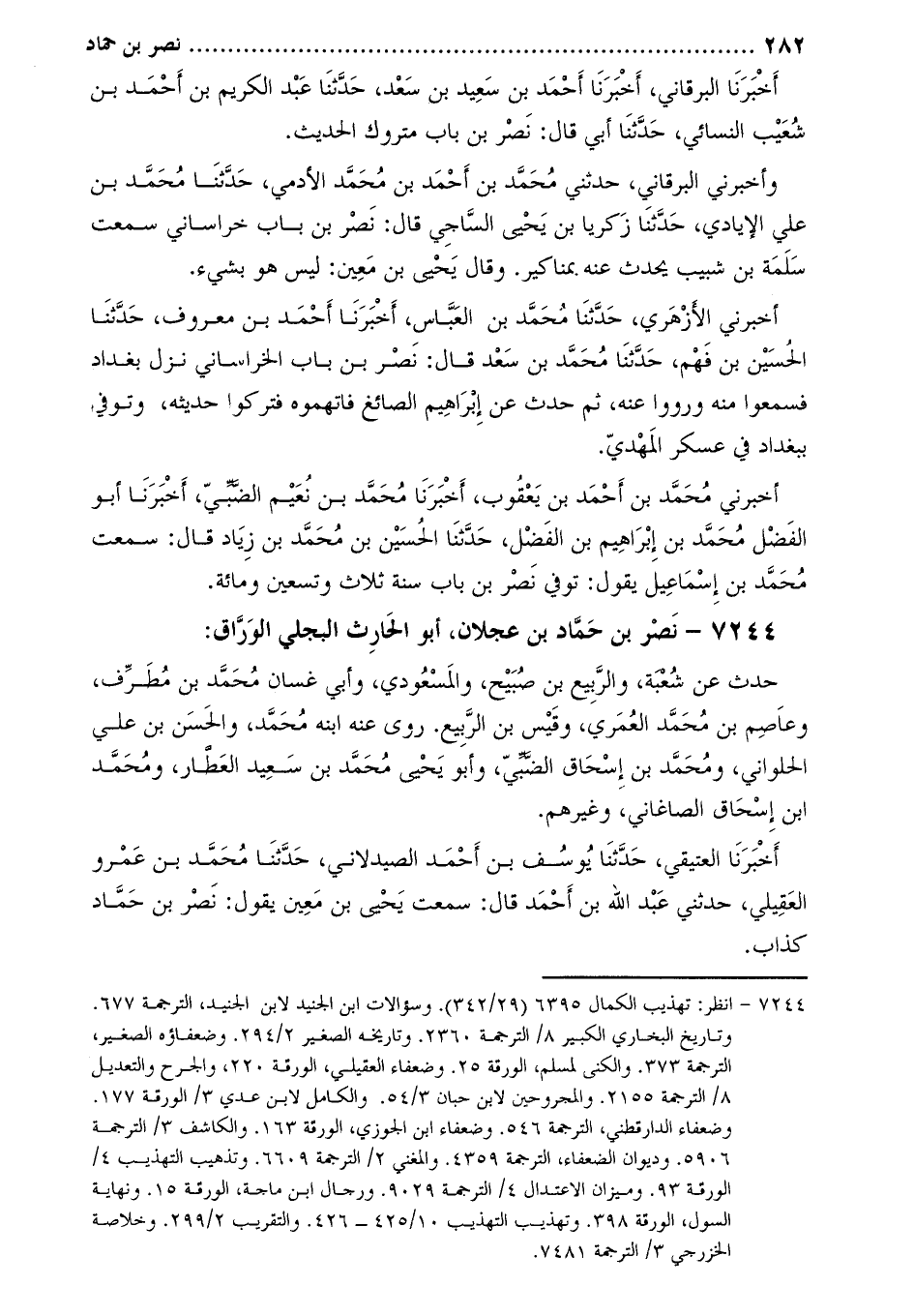 7244- نصر بن حَمَّاد بن عجلان، أَبُو الحارث البَجَلِيّ الوَرَّاق [1] :