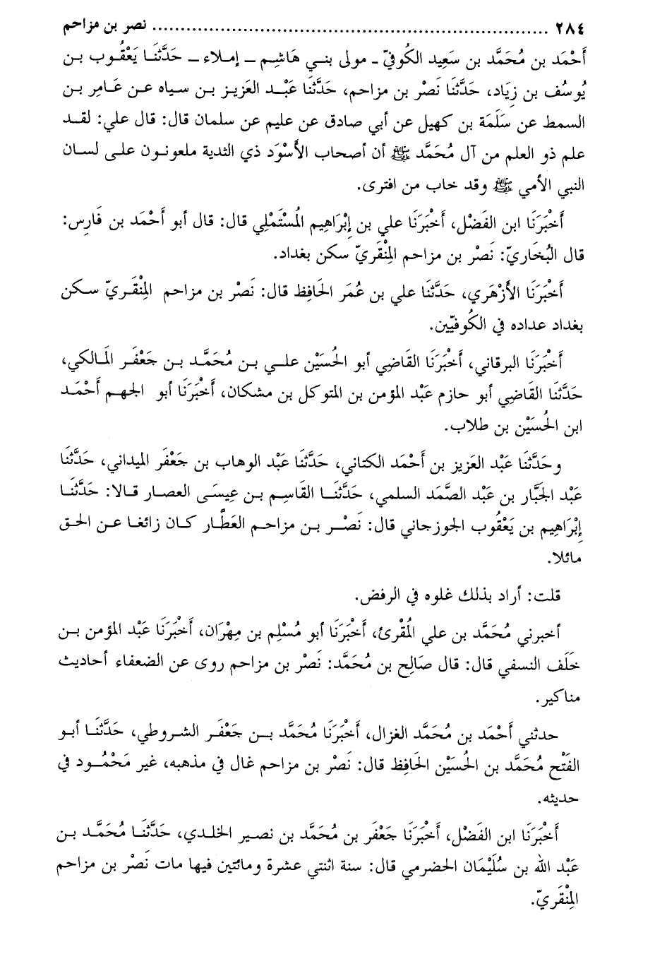 حَدَّثَنِي أَحْمَد بن محمّد الغزال، أخبرنا محمّد بن جعفر الشروطي، حدّثنا أَبُو الفَتْح مُحَمَّد بن الحُسَيْن الحَافِظ قَالَ: نصر بن مُزَاحِم غال في مذهبه، غير محمود في حديثه.