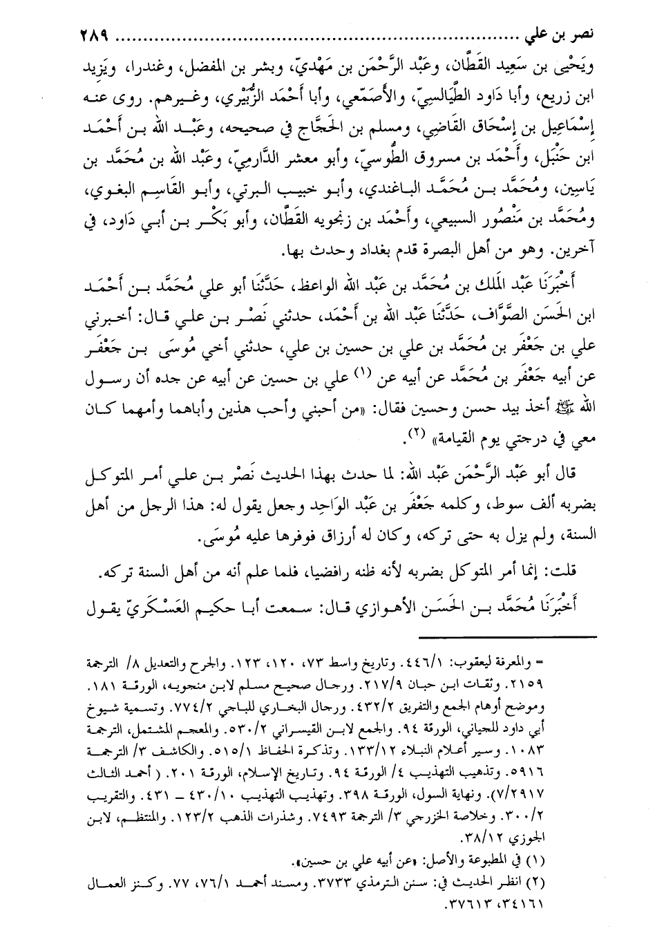 أَخْبَرَنَا عَبْدُ الْمَلِكِ بْنُ مُحَمَّدِ بْنِ عبد الله الواعظ، حدثنا أبو علي محمد بن أحمد ابن الحسن الصّوّاف، حدّثنا عبد الله بن أحمد، حَدَّثَنِي نَصْرُ بْنُ عَلِيٍّ قَالَ: أَخْبَرَنِي عَلِيُّ بْنُ جَعْفَرِ بْنِ مُحَمَّد بْنِ عَلِيِّ بْنِ حسين بن علي، حَدَّثَنِي أَخِي مُوسَى بْنِ جَعْفَرٍ عَنْ أَبِيهِ جَعْفَرِ بْنِ مُحَمَّدٍ عَنْ أَبِيهِ عَنْ [1] عَلِيٍّ بْنِ حُسَيْنٍ عَنْ أَبِيهِ عَنْ جَدِّهِ أَنَّ رَسُولَ اللَّهِ صَلَّى اللَّهُ عَلَيْهِ وَسَلَّمَ أَخَذَ بِيَدِ حَسَنٍ وَحُسَيْنٍ فَقَالَ: «مَنْ أَحَبَّنِي وَأَحَبَّ هَذَيْنِ وَأَبَاهُمَا وَأُمَّهُمَا كَانَ مَعِي فِي دَرَجَتِي يَوْمَ الْقِيَامَةِ» [2] .