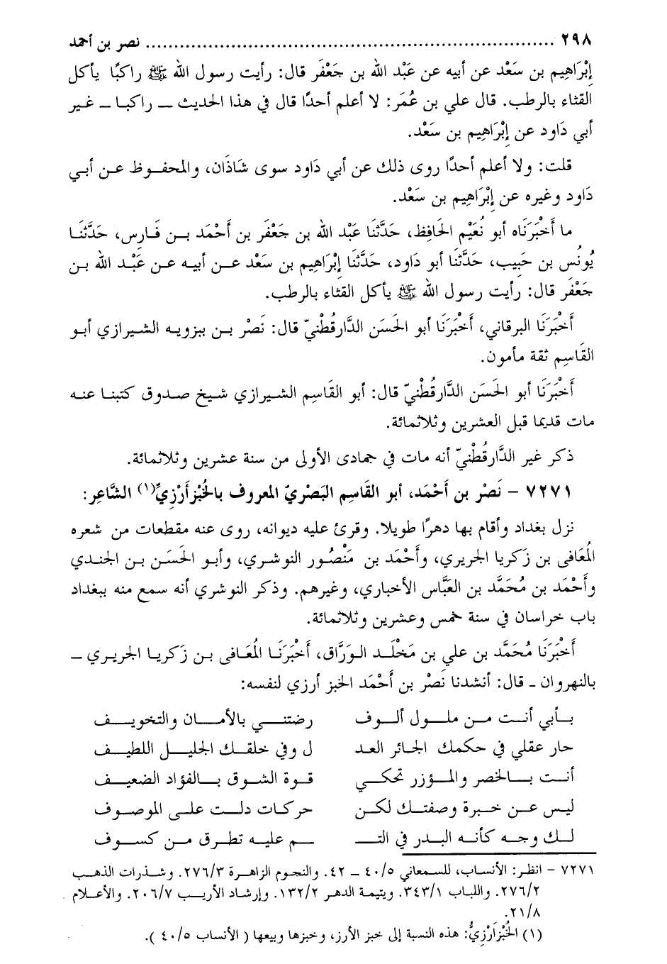 أَخْبَرَنَا مُحَمَّد بْن عَلِيّ بْن مَخْلَدٍ الْوَرَّاقُ، أَخْبَرَنَا المعافى بن زكريا الجريري- بالنهروان- قال: أنشدنا نصر بن أَحْمَد الخبزأرزي لنفسه: