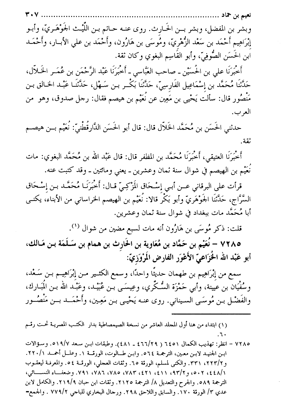 7285- نعيم بن حماد بن معاوية بن الحارث بن همام بن سلمة بن مالك، أَبُو عبد الله الخزاعي الأعور الفارض المروزي [2] :