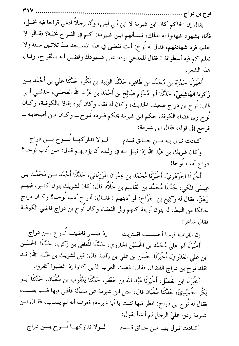 أَخْبَرَنَا أَبُو عَلِيٍّ مُحَمَّد بْن الْحُسَيْن الجازري، حدّثنا المعافى بن زكريا، حدّثنا الحسن ابن علي العدويّ، أَخْبَرَنَا الحسن بن علي بن راشد قال: قيل لشريك بن عبد الله: قد تقلد نوح بن دراج القضاء. فقال: ذهبت العرب الذين كانوا إذا غضبوا كفروا.