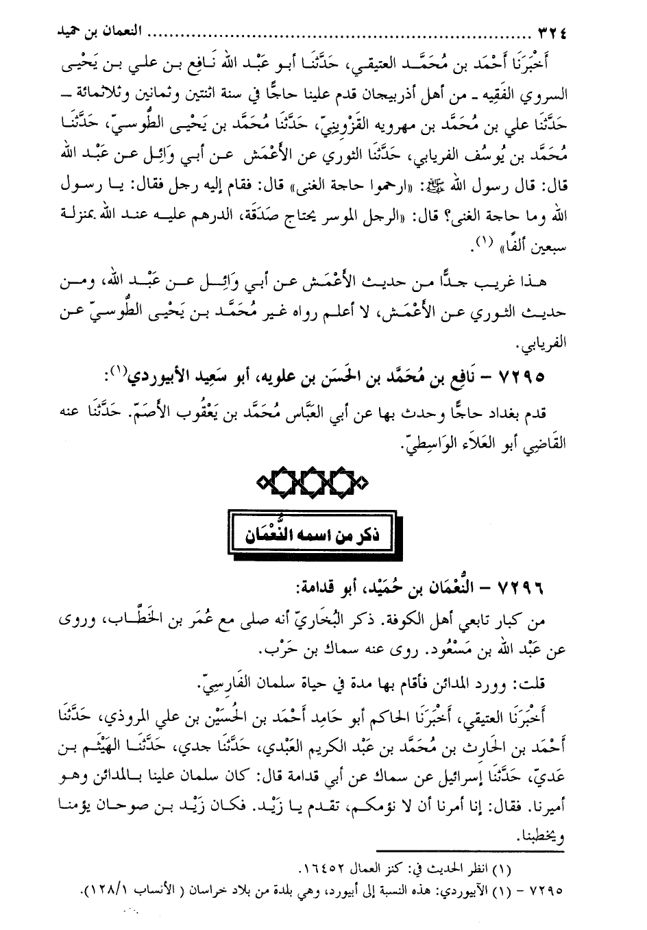 حَدَّثَنَا عَلِيُّ بْنُ مُحَمَّدِ بْنِ مَهْرَوَيْهِ الْقَزْوِينِيُّ، حدّثنا محمّد بن يحيى الطّوسيّ، حدّثنا محمّد بن يوسف الفريابي، حَدَّثَنَا الثَّوْرِيُّ عَنِ الأَعْمَشِ عَنْ أَبِي وَائِلٍ عَنْ عَبْدِ اللَّهِ قَالَ: قَالَ رَسُولُ اللَّهِ صَلَّى اللَّهُ عَلَيْهِ وَسَلَّمَ: «ارْحَمُوا حَاجَةَ الْغَنِيِّ» قَالَ: فَقَامَ إِلَيْهِ رَجُلٌ فَقَالَ: يَا رَسُولَ الله وما حاجة الغنى؟ قال: «الرَّجُلُ الْمُوسِرُ يَحْتَاجُ صَدَقَةً، الدِّرْهَمُ عَلَيْهِ عِنْدَ الله بمنزلة سبعين ألفا» [1] .