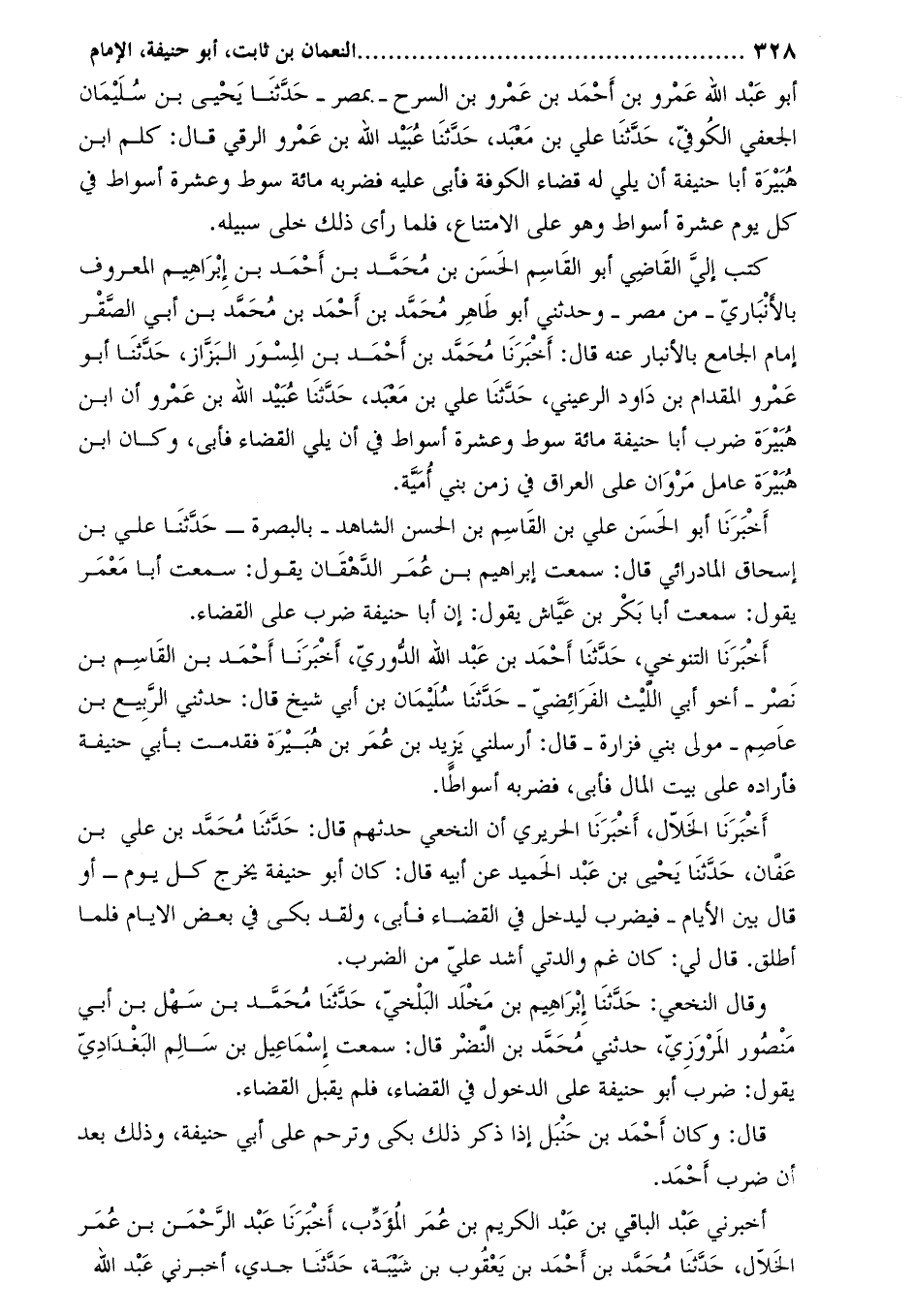 كتب إليَّ الْقَاضِي أَبُو القاسم الحسن بن مُحَمَّد بن أَحْمَد بن إبراهيم المعروف بالأنباري- من مصر- وحَدَّثَنِي أَبُو طَاهِرٍ مُحَمَّدُ بْنُ أَحْمَدَ بْنِ مُحَمَّدِ بْن أَبِي الصقر إمام الجامع بالأنبار عنه قَالَ: أَخْبَرَنَا مُحَمَّد بن أَحْمَد بن المسور البزّاز، حَدَّثَنَا أَبُو عمرو المقدام بن داود الرعيني، حدّثنا علي بن معبد، حَدَّثَنَا عبيد الله بن عمرو أن ابن هبيرة ضرب أبا حنيفة مائة سوط وعشرة أسواط في أن يلي القضاء فأبَى، وكان ابن هبيرة عامل مَرْوَان على العراق في زمن بني أمية.