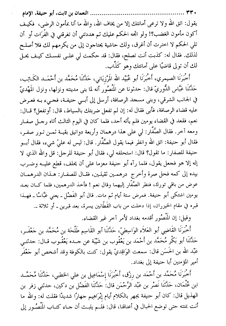 أَخْبَرَنَا الْقَاضِي أَبُو العلاء الواسطيّ، حَدَّثَنَا أَبُو الْقَاسِمِ طَلْحَةُ بْنُ مُحَمَّدِ بْنِ جَعْفَرِ، حَدَّثَنَا أَبُو بَكْرٍ مُحَمَّدُ بْنُ أَحْمَدَ بْنِ يَعْقُوب بن شيبة عن جده يَعْقُوب قال: حَدَّثَنِي عبد الله بن الحسن قال: سمعت الواقدي يقول: كنت بالكوفة وقد أشخص أَبُو جعفر أمير المؤمنين أبا حنيفة إِلَى بغداد.