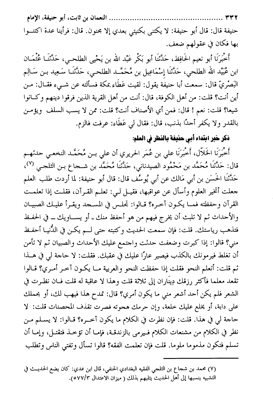 ذكر خبر ابتداء أبي حنيفة بالنظر في العلم: