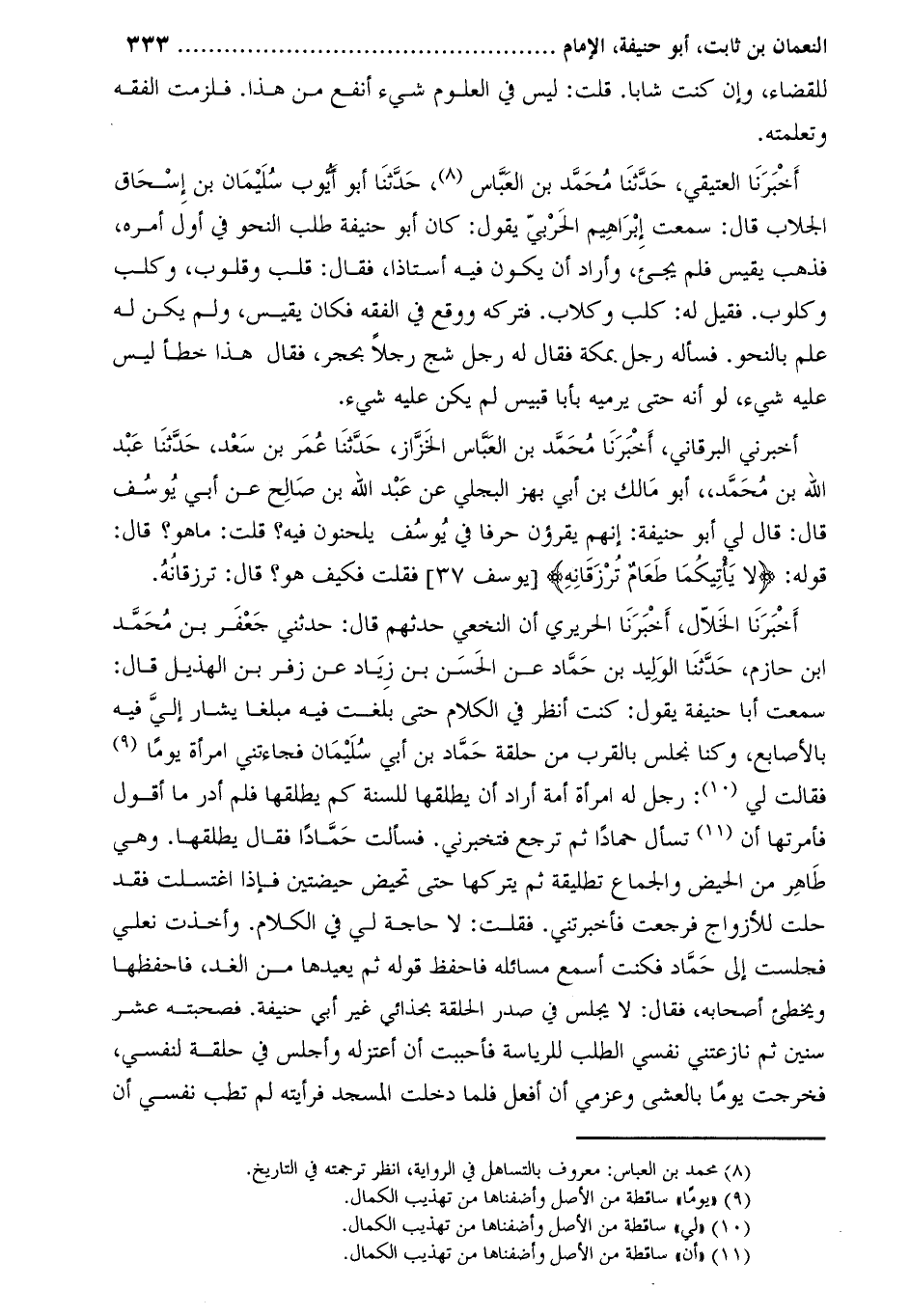 سمعت أبا حنيفة يقول: كنت أنظر في الكلام حتى بلغت فيه مبلغا يشار إلي فيه بالأصابع، وكنا نجلس بالقرب من حلقة حماد بن أبي سليمان فجاءتني امرأة يوما [2] فقالت لي [3] : رجل له امرأة أمة أراد أن يطلقها للسنة كم يطلقها فلم أدر ما أقول فأمرتها أن [4] تسأل حمادا ثم ترجع فتخبرني. فسألت حمادا فقال يطلقها. وهي طاهر من الحيض والجماع تطليقة ثم يتركها حتى تحيض حيضتين فإذا اغتسلت فقد حلت للأزواج فرجعت فأخبرتني. فقلت: لا حاجة لي في الكلام. وأخذت نعلي فجلست إلى حماد فكنت أسمع مسائله فأحفظ قوله ثم يعيدها من الغد، فأحفظها ويخطئ أصحابه، فقال: لا يجلس في صدر الحلقة بحذائي غير أبي حنيفة. فصحبته عشر سنين ثم نازعتني نفسي الطلب للرئاسة فأحببت أن أعتزله وأجلس في حلقة لنفسي، فخرجت يوما بالعشي وعزمي أن أفعل فلما دخلت المسجد فرأيته لم تطب نفسي أن