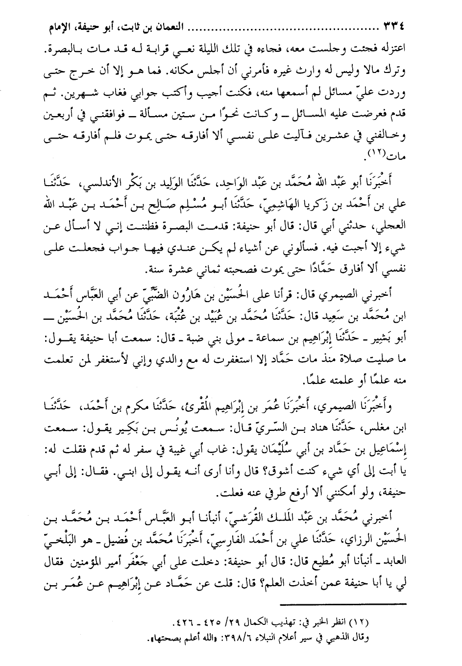 أخبرنا أَبُو عَبْد اللَّه مُحَمَّد بْن عَبْد الواحد، حدّثنا الوليد بن بكر الأندلسي، حدثنا علي بن أحمد بن زكريا الهاشمي، حدثنا أبو مسلم صالح بن أحمد بن عبد الله العجلي، حَدَّثَنِي أبي قال: قال أَبُو حنيفة: قدمت البصرة فظننت أني لا أسأل عن شيء إلا أجبت فيه. فسألوني عن أشياء لم يكن عندي فيها جواب فجعلت على نفسي ألا أفارق حمادا حتى يموت فصحبته ثماني عشرة سنة.