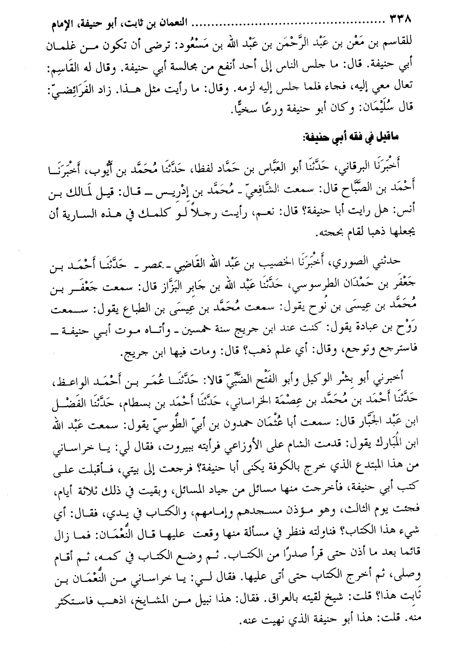 أَخْبَرَنِي أَبُو بشر الوكيل وأبو الفتح الضبي قالا: حدثنا عمر بن أحمد الواعظ، حَدَّثَنَا أَحْمَد بْن مُحَمَّد بْن عصمة الخراساني، حدّثنا أحمد بن بسطام، حدّثنا الفضل ابن عبد الجبار قال: سمعت أبا عثمان حمدون بن أبي الطوسي يقول: سمعت عبد الله ابن المبارك يقول: قدمت الشام على الأوزاعي فرأيته ببيروت، فقال لي: يا خراساني من هذا المبتدع الذي خرج بالكوفة يكنى أبا حنيفة؟ فرجعت إلى بيتي، فأقبلت على كتب أبي حنيفة، فأخرجت منها مسائل من جياد المسائل، وبقيت في ذلك ثلاثة أيام، فجئت يوم الثالث، وهو مؤذن مسجدهم وإمامهم، والكتاب في يدي، فقال: أي شيء هذا الكتاب؟ فناولته فنظر في مسألة منها وقعت عليها قال النّعمان: فما زال قائما بعد ما أذن حتى قرأ صدرا من الكتاب. ثم وضع الكتاب في كمه، ثم أقام وصلى، ثم أخرج الكتاب حتى أتى عليها. فقال لي: يا خراساني من النعمان بن ثابت هذا؟ قلت: شيخ لقيته بالعراق. فقال: هذا نبيل من المشايخ، اذهب فاستكثر منه. قلت: هذا أَبُو حنيفة الذي نهيت عنه.