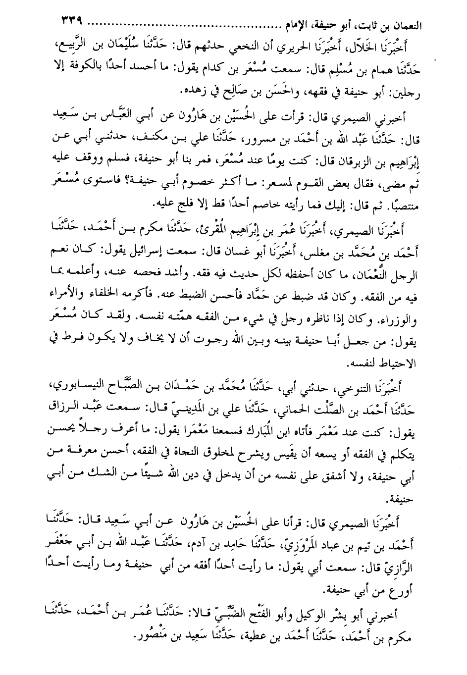 أخبرنا الخلّال، أخبرنا الحريري أن النخعي حدثهم قال: حدثنا سليمان بن الرّبيع، حَدَّثَنَا همام بن مسلم قال: سمعت مسعر بن كدام يقول: ما أحسد أحدا بالكوفة إلا رجلين: أَبُو حنيفة في فقهه، والحسن بن صالح في زهده.