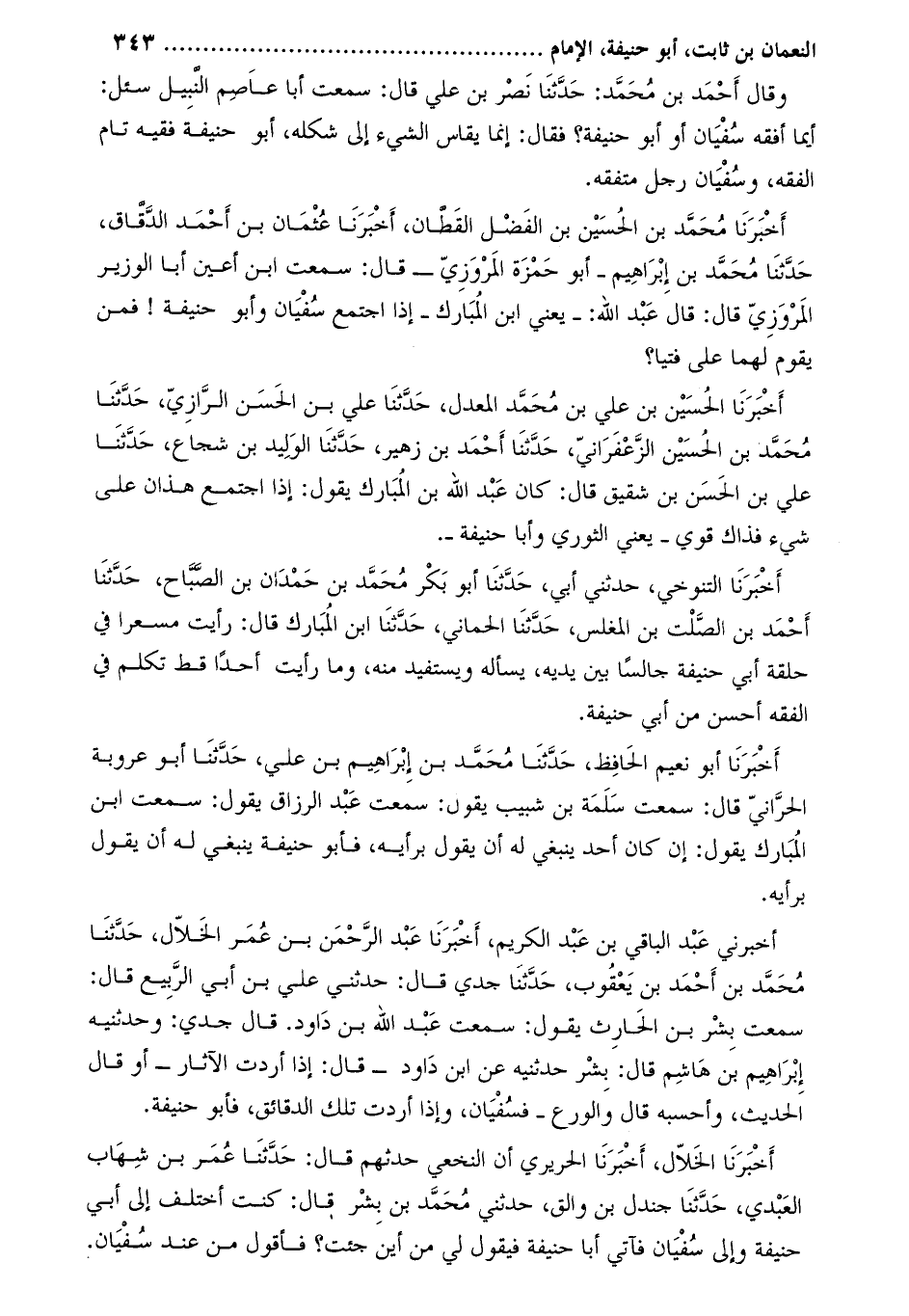 أخبرنا التنوخي، حدثني أبي، حَدَّثَنَا أَبُو بَكْر مُحَمَّد بْن حَمْدَانَ بْن الصّبّاح، حدّثنا أحمد بن الصّلت بن المغلس، حدّثنا الحماني، حَدَّثَنَا ابن المبارك قال: رأيت مسعرا في حلقة أبي حنيفة جالسا بين يديه، يسأله ويستفيد منه، وما رأيت أحدا قط تكلم في الفقه أحسن من أبي حنيفة.