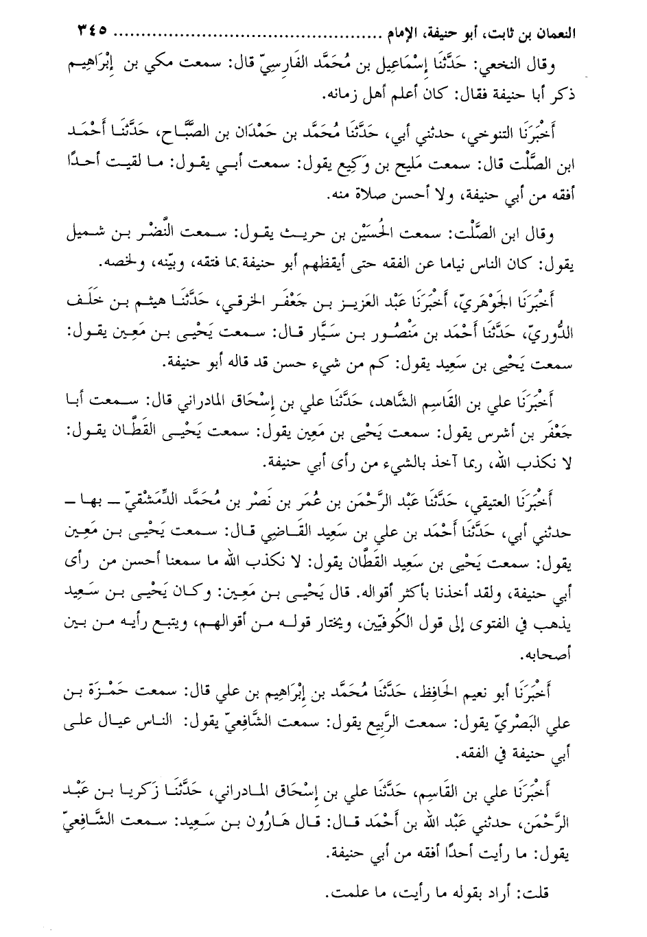 أخبرنا العتيقي، حَدَّثَنَا عَبْد الرَّحْمَن بْن عُمَر بْن نصر بن محمّد الدّمشقيّ- بها- حدثني أبي، حَدَّثَنَا أَحْمَد بن علي بن سعيد الْقَاضِي قَالَ: سمعت يَحْيَى بن معين يَقُول: سمعت يَحْيَى بْن سعيد القطان يَقُولُ: لا نكذب الله ما سمعنا أحسن من رأي أبي حنيفة، ولقد أخذنا بأكثر أقواله. قال يحيى بن معين: وكان يحيى بن سعيد يذهب في الفتوى إلى قول الكوفيين، ويختار قوله من أقوالهم، ويتبع رأيه من بين أصحابه.