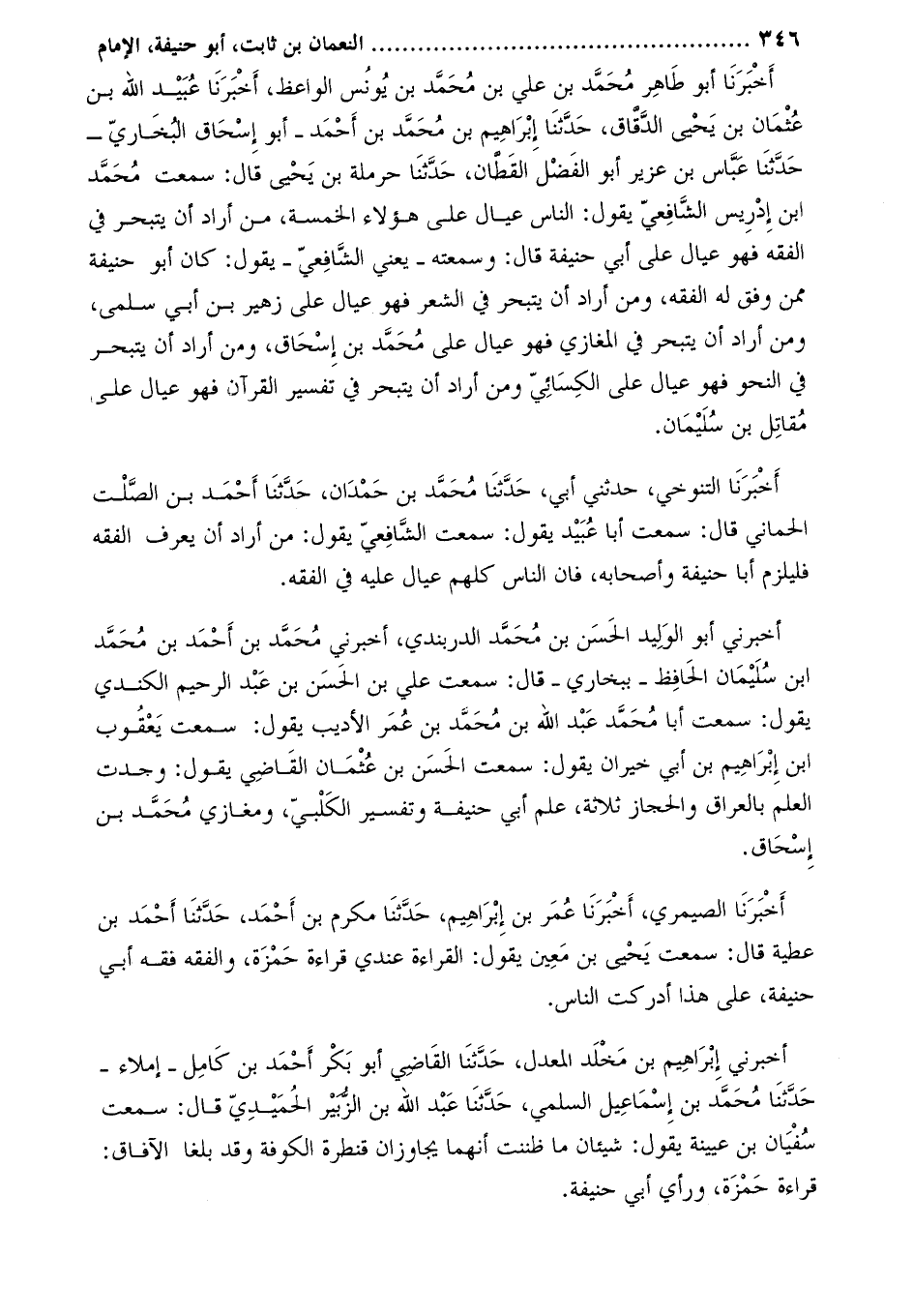 أَخْبَرَنَا أَبُو طَاهِرٍ مُحَمَّدُ بْنُ عَلِيِّ بْنِ مُحَمَّدٍ بن يونس الواعظ، أَخْبَرَنَا عبيد اللَّه بْن عثمان بْن يحيى الدقاق، حَدَّثَنَا إبراهيم بن مُحَمَّد بن أَحْمَد- أَبُو إسحاق البخاريّ- حدّثنا عبّاس بن عزيز أبو الفضل القطّان، حَدَّثَنَا حرملة بن يحيى قال: سمعت مُحَمَّد ابن إدريس الشافعي يقول: الناس عيال على هؤلاء الخمسة، من أراد أن يتبحر في الفقه فهو عيال على أبي حنيفة قال: وسمعته- يعني الشافعي- يقول: كان أَبُو حنيفة ممن وفق له الفقه، ومن أراد أن يتبحر في الشعر فهو عيال على زهير بن أبي سلمى، ومن أراد أن يتبحر في المغازي فهو عيال على مُحَمَّد بن إسحاق، ومن أراد أن يتبحر فِي النحو فهو عيال على الكسائي ومن أراد أن يتبحر في تفسير القرآن فهو عيال على مقاتل بن سليمان.