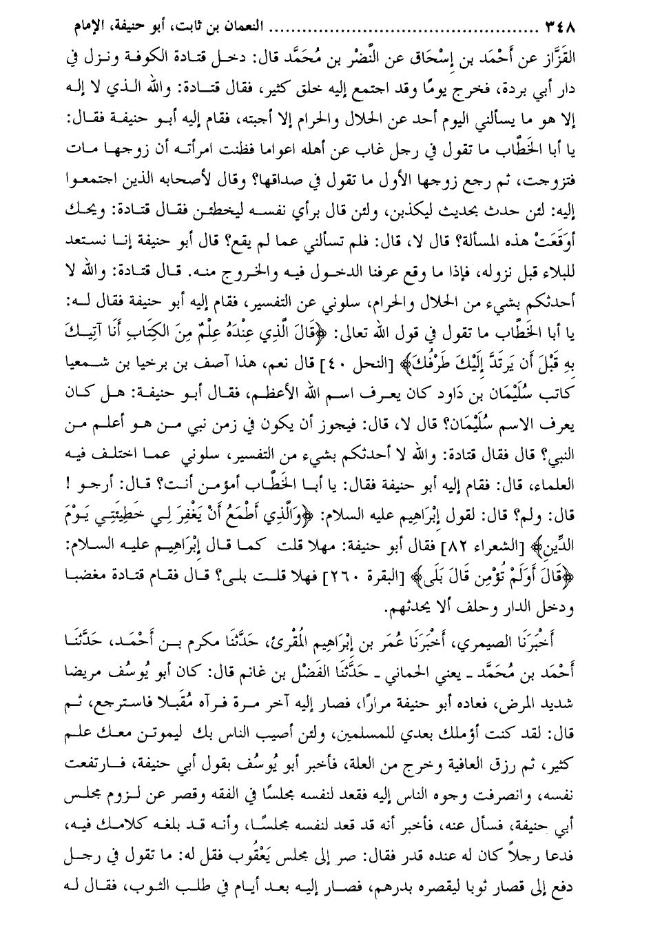 [النحل 40] قال نعم، هذا آصف بن برخيا بن شمعيا كاتب سليمان بن داود كان يعرف اسم الله الأعظم، فقال أَبُو حنيفة: هل كان يعرف الاسم سليمان؟ قال لا، قال: فيجوز أن يكون في زمن نبي من هو أعلم من النبي؟ قال فقال قتادة: والله لا أحدثكم بشيء من التفسير، سلوني عما اختلف فيه العلماء، قال: فقام إليه أَبُو حنيفة فقال: يا أبا الخطّاب أمؤمن أنت؟ قال: أرجوا! قال: ولم؟ قال: لقول إبراهيم عليه السلام: وَالَّذِي أَطْمَعُ أَنْ يَغْفِرَ لِي خَطِيئَتِي يَوْمَ الدِّينِ
