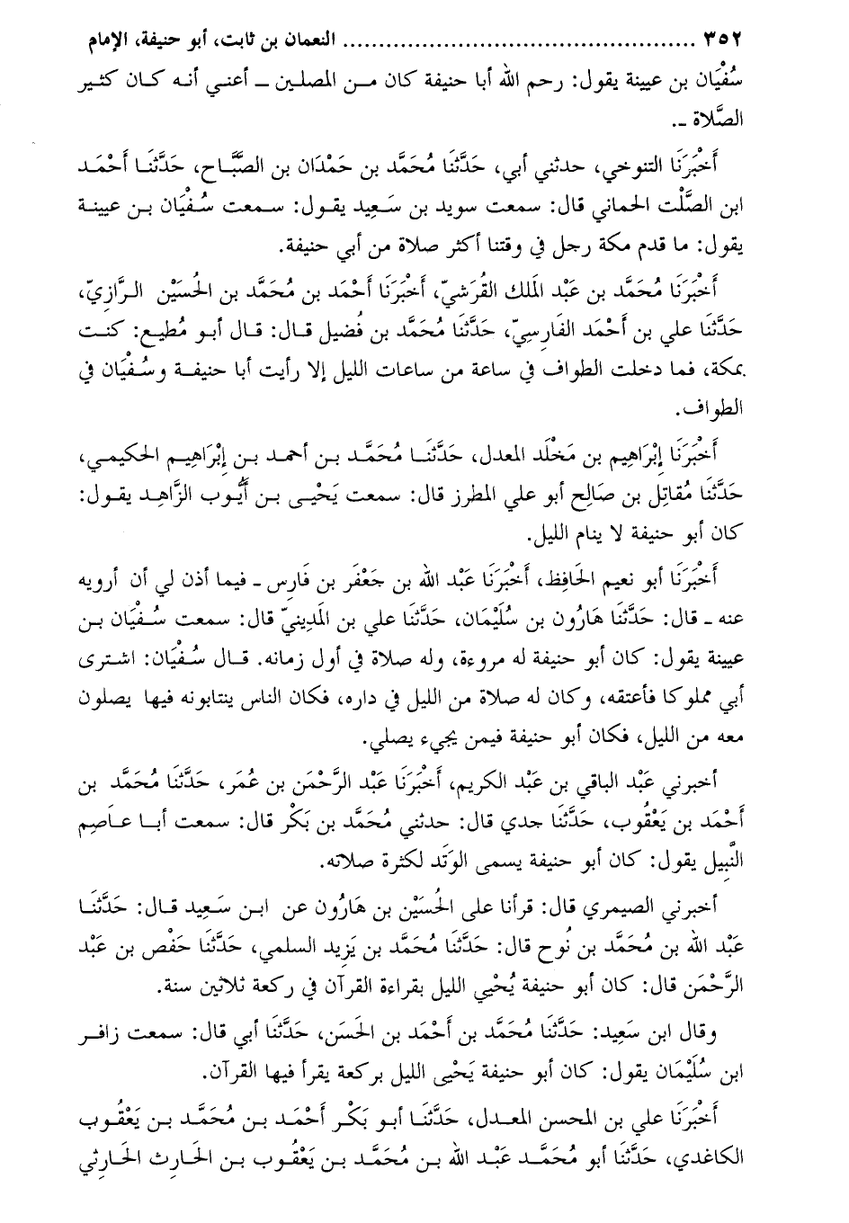 أخبرنا التنوخي، حدثني أبي، حدّثنا محمّد بن حمدان بن الصّبّاح، حدّثنا أحمد ابن الصلت الحماني قال: سمعت سويد بن سعيد يقول: سمعت سفيان بن عيينة يقول: ما قدم مكة رجل في وقتنا أكثر صلاة من أبي حنيفة.