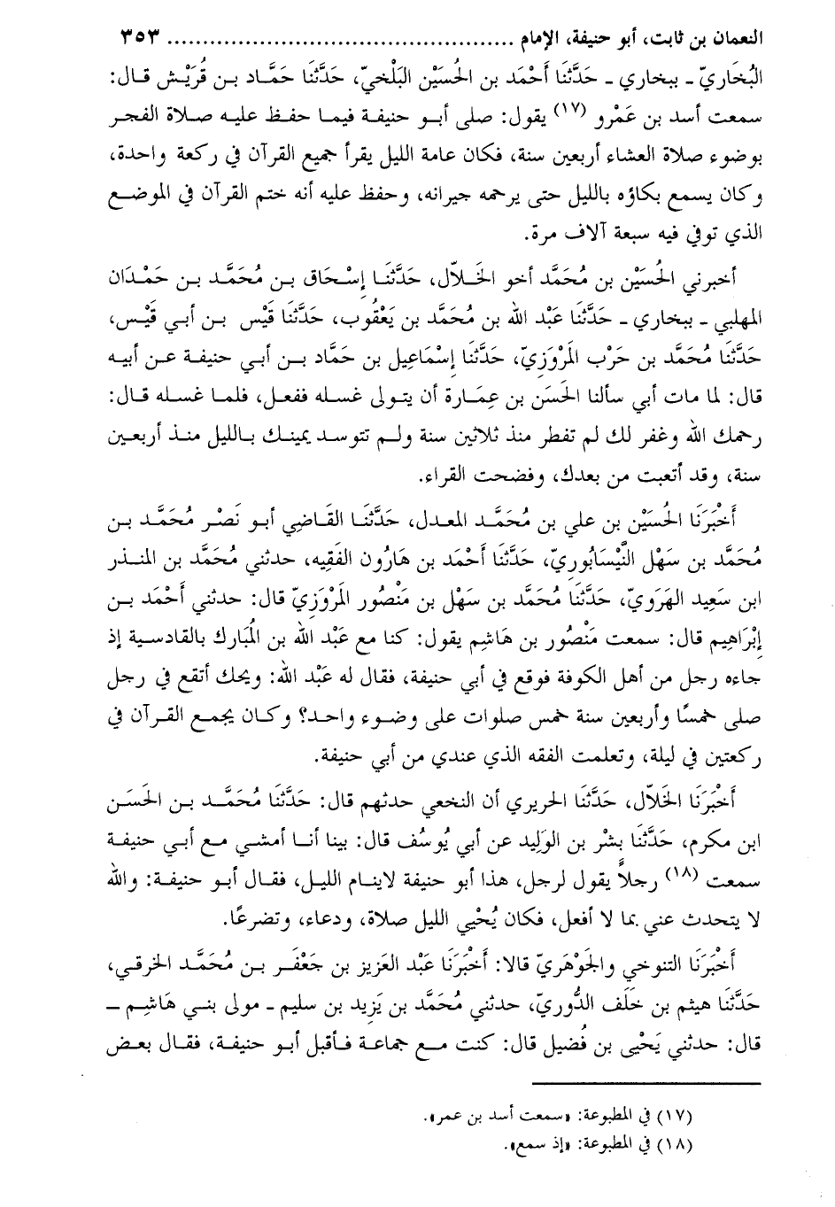سمعت أسد بن عمرو [1] يقول: صلى أَبُو حنيفة فيما حفظ عليه صلاة الفجر بوضوء صلاة العشاء أربعين سنة، فكان عامة الليل يقرأ جميع القرآن في ركعة واحدة، وكان يسمع بكاؤه بالليل حتى يرحمه جيرانه، وحفظ عليه أنه ختم القرآن في الموضع الذي توفي فيه سبعة آلاف مرة.