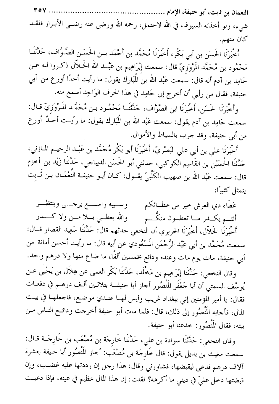 أخبرنا علي بن أبي علي البصريّ، أَخْبَرَنَا أَبُو بَكْر مُحَمَّد بن عَبْد الرَّحِيم المازني، حدّثنا الحسين بن القاسم الكوكبي، حدثني أبو الحسن الديباجي، حَدَّثَنَا زيد بن أخزم قَالَ: سَمِعْتُ عَبْد الله بن صهيب الكلبي يَقُولُ: كَانَ أَبُو حنيفة النُّعْمَان بن ثابت يتمثل كثيرا: