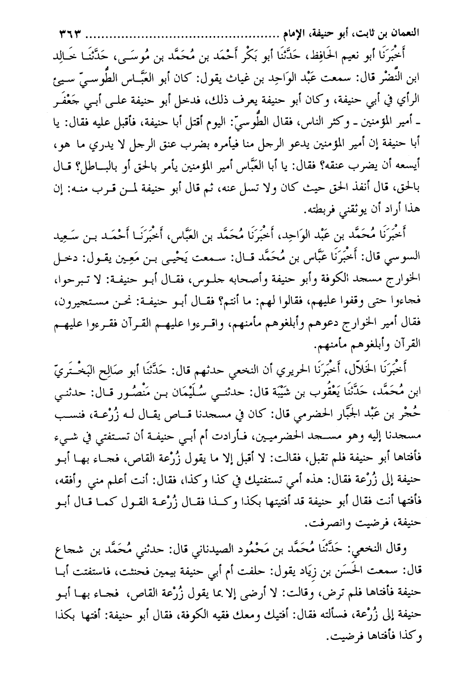 أخبرنا أبو نعيم الحافظ، حَدَّثَنَا أبو بكر أحمد بن محمد بن موسى، حدّثنا خالد ابن النضر قَالَ: سَمِعْتُ عَبْد الواحد بن غياث يَقُولُ: كَانَ أَبُو العَبَّاس الطُّوسِيّ سيئ الرأي في أَبِي حنيفة، وَكَانَ أَبُو حنيفة يعرف ذَلِكَ، فدخل أَبُو حنيفة عَلَى أَبِي جَعْفَر- أمير المؤمنين- وكثر النَّاس، فَقَالَ الطُّوسِيّ: اليوم أقتل أَبَا حنيفة، فأقبل عَلَيْهِ فَقَالَ: يا أَبَا حنيفة إن أمير المؤمنين يدعو الرجل منا فيأمره بضرب عنق الرجل لا يدري ما هو، أيسعه أن يضرب عنقه؟ فَقَالَ: يا أَبَا العَبَّاس أمير المؤمنين يأمر بالحق أَوْ بالباطل؟ قَالَ بالحق، قَالَ انفذ الحق حيث كَانَ ولا تسل عَنْهُ، ثُمّ قَالَ أَبُو حنيفة لمن قرب منه: إِنَّ هَذَا أراد أن يوثقني فربطته.