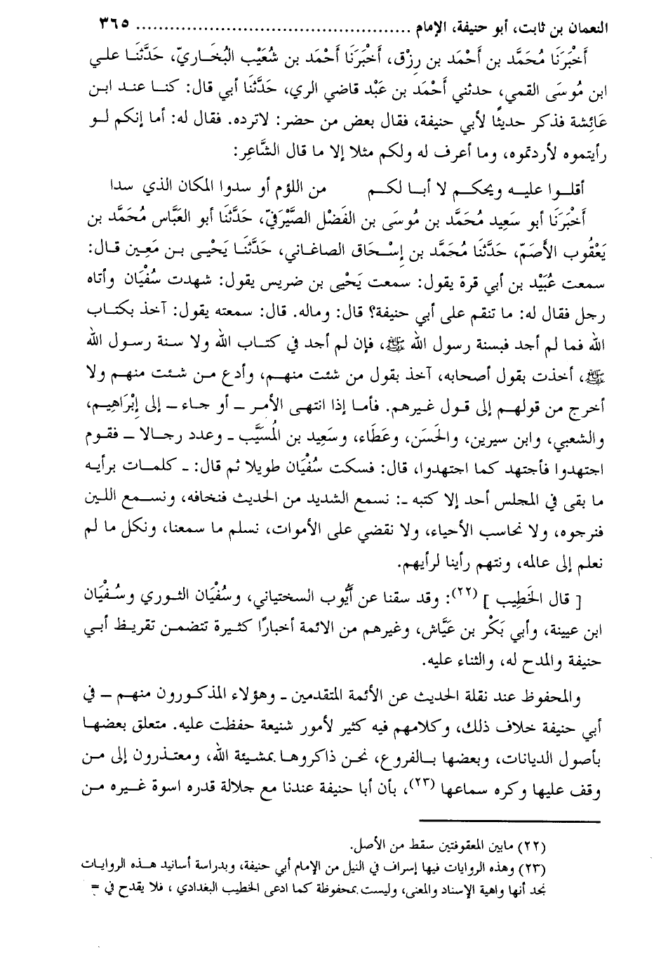والمحفوظ عند نقلة الحديث عن الأئمة المتقدمين- وَهَؤُلاءِ المذكورون منهم- في أبي حنيفة خلاف ذَلِكَ، وكلامهم فيه كثير لأمور شنيعة حفظت عَلَيْهِ. متعلق بعضها بأصول الديانات، وبعضها بالفروع، نَحْنُ ذاكروها بمشيئة الله، ومعتذرون إلى من وقف عليها وكره سماعها [2] ، بأن أَبَا حنيفة عندنا مَعَ جلالة قدره أسوة غيره من