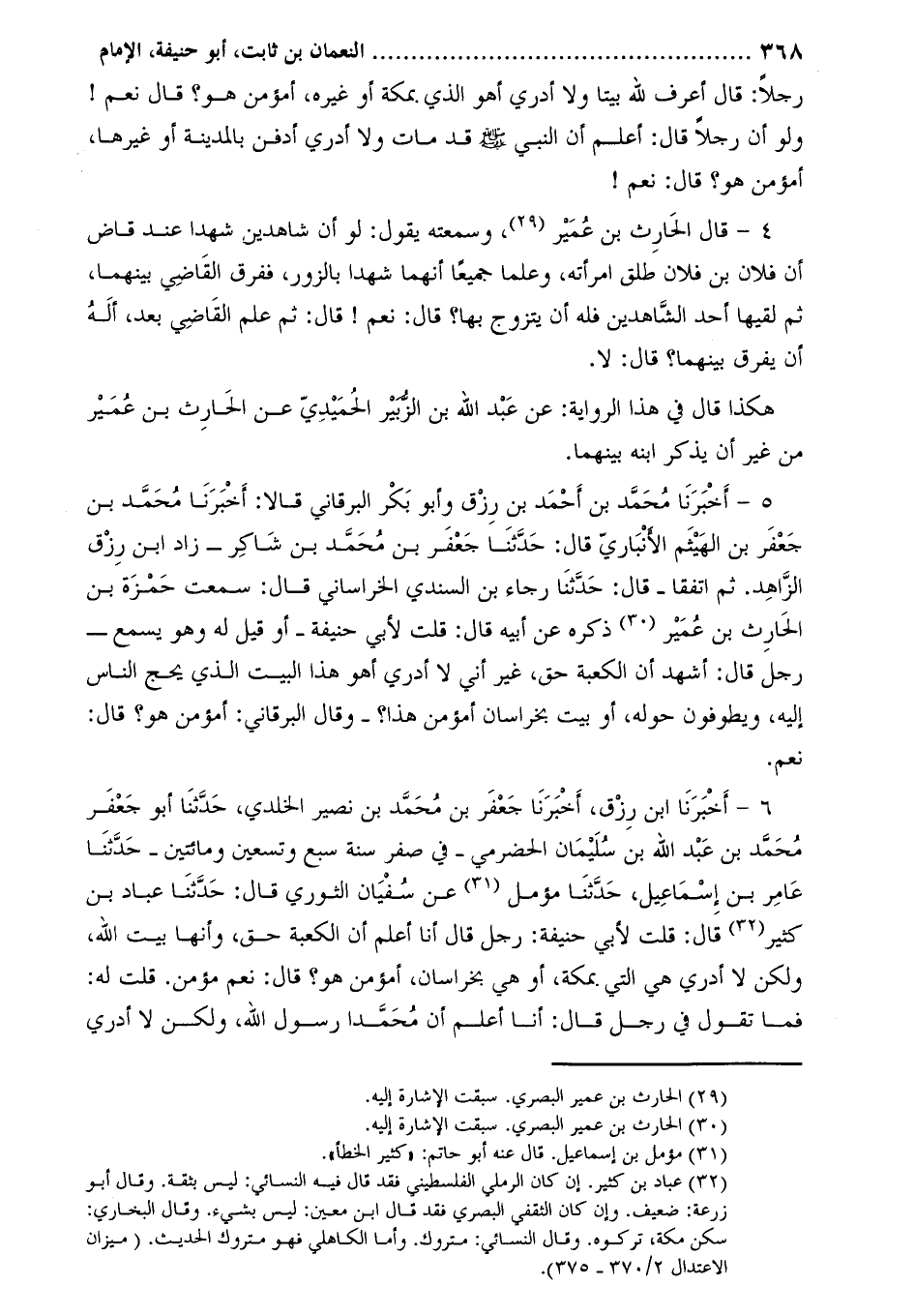 6- أَخْبَرَنَا ابن رزق، أخبرنا جعفر بن محمد بن نصير الخلدي، حدثنا أَبُو جَعْفَرٍ مُحَمَّدُ بْنُ عَبْدِ اللَّهِ بْنِ سُلَيْمَان الحَضْرَمِيّ- في صفر سنة سبع وتسعين ومائتين- حدّثنا عامر بن إسماعيل، حَدَّثَنَا مؤمل [3] عن سفيان الثوري قال: حَدَّثَنَا عباد بن كثير [4] قَالَ: قُلْتُ لأبي حنيفة: رجل قَالَ أَنَا أعلم أن الكعبة حق، وأنها بيت الله، ولكن لا أدري هِيَ التي بمَكَّة، أَوْ هِيَ بخُرَاسَان، أمؤمن هُوَ؟ قَالَ: نعم مؤمن. قُلْتُ لَهُ: