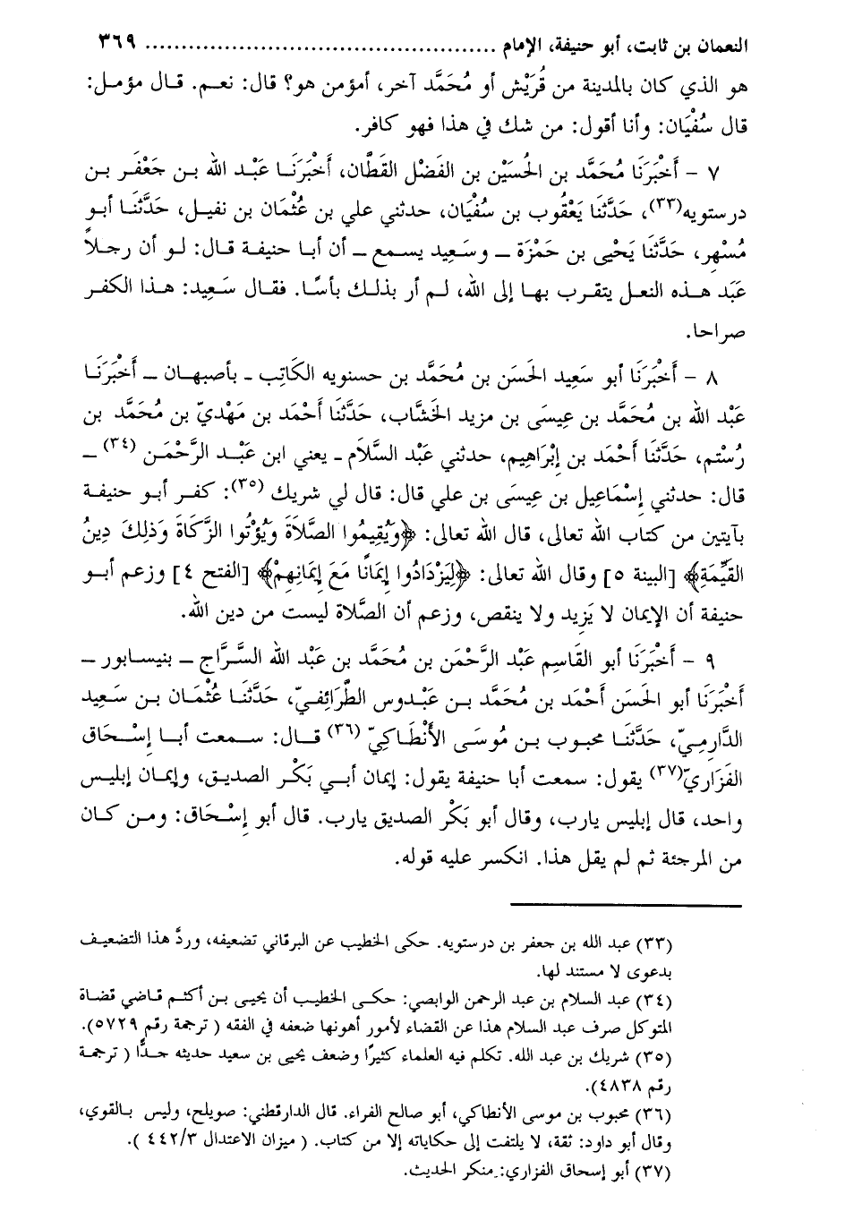 8- أَخْبَرَنَا أَبُو سَعِيد الحَسَن بن مُحَمَّد بن حسنويه الكاتب- بأصبهان- أخبرنا عَبْد اللَّهِ بْن مُحَمَّد بْن عيسى بن مزيد الخشّاب، حدّثنا أحمد بن مهديّ بن محمّد بن رستم، حدّثنا أحمد بن إبراهيم، حَدَّثَنِي عَبْد السَّلام- يعني ابن عَبْد الرَّحْمَن [2] قَالَ: حَدَّثَنِي إِسْمَاعِيل بن عيسى بن علي قَالَ: قَالَ لي شريك [3] : كفر أَبُو حنيفة بآيتين من كتاب الله تعالى، قَالَ الله تعالى: وَيُقِيمُوا الصَّلاةَ وَيُؤْتُوا الزَّكاةَ وَذلِكَ دِينُ الْقَيِّمَةِ