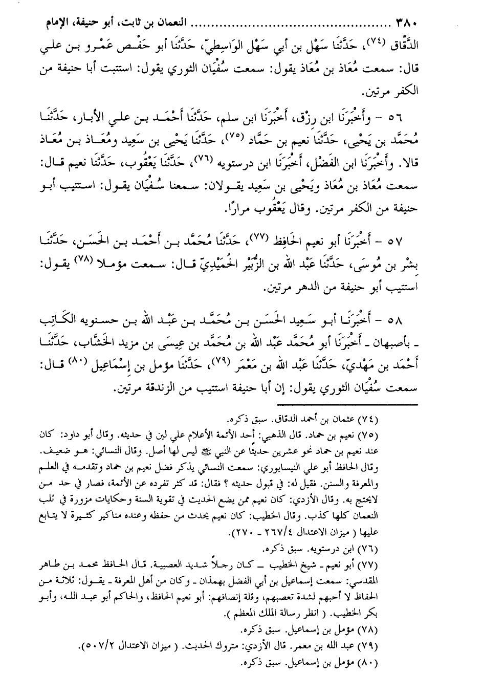 الدّقّاق [1] ، حدّثنا سهل بن أبي سهل الواسطيّ، حدثنا أبو حفص عمرو بن علي قال: سمعت معاذ بن معاذ يقول: سمعت سفيان الثوري يقول: استتبت أبا حنيفة من الكفر مرتين.