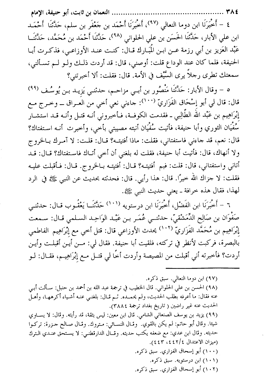 4- أخبرنا ابن دوما النعالي [1] ، أَخْبَرَنَا أَحْمَد بْن جعفر بْن سلم، حَدَّثَنَا أحمد ابن علي الأبار، حدّثنا الحسن بن علي الحلواني [2] ، حدّثنا أحمد بن محمّد، حَدَّثَنَا عبد العزيز بن أبي رزمة عن ابن المبارك قال: كنت عند الأوزاعي، فذكرت أبا الحنيفة، فلما كان عند الوداع قلت: أوصني، قال: قد أردت ذلك ولو لم تسألني، سمعتك تطري رجلا يرى السيف في الأمة. قال: فقلت: ألا أخبرتني؟