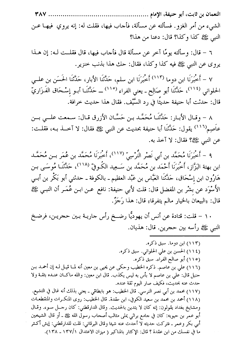 7- أَخْبَرَنَا ابن دوما [1] أخبرنا ابن سلم، حدّثنا الأبار، حدّثنا الحسن بن علي الحلواني [2] ، حدّثنا أبو صالح- يعني الفراء [3]- حَدَّثَنَا أَبُو إسحاق الفزاري قال: حدثت أبا حنيفة حديثا في رد السيف. فقال هذا حديث خرافة.