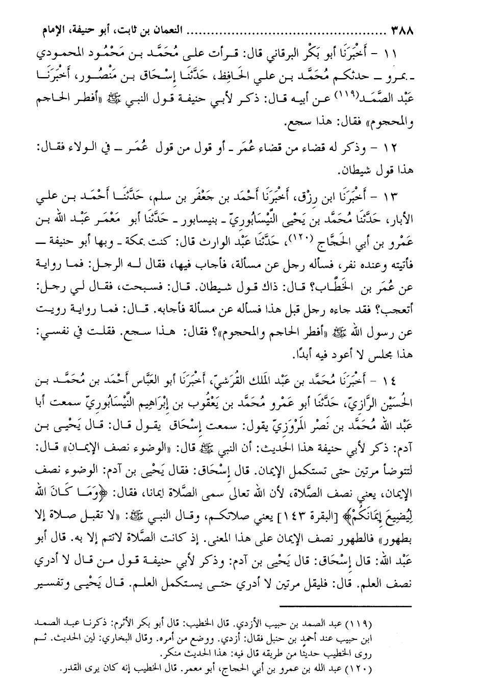 11- أَخْبَرَنَا أَبُو بَكْرٍ الْبَرْقَانِيُّ قَالَ: قَرَأْتُ عَلَى مُحَمَّدِ بْنِ مَحْمُودٍ الْمَحْمُودِيُّ- بِمَرْوَ- حَدَّثَكُمْ مُحَمَّدُ بن علي الحافظ، حدّثنا إسحاق بن منصور، أَخْبَرَنَا عَبْدُ الصَّمَدِ [1] عَنْ أَبِيهِ قَالَ: ذُكِرَ لأَبِي حَنِيفَةَ قَوْلُ النَّبِيِّ صَلَّى اللَّهُ عَلَيْهِ وَسَلَّمَ «أَفْطَرَ الْحَاجِمُ وَالْمَحْجُومُ» فَقَالَ: هَذَا سَجْعٌ.