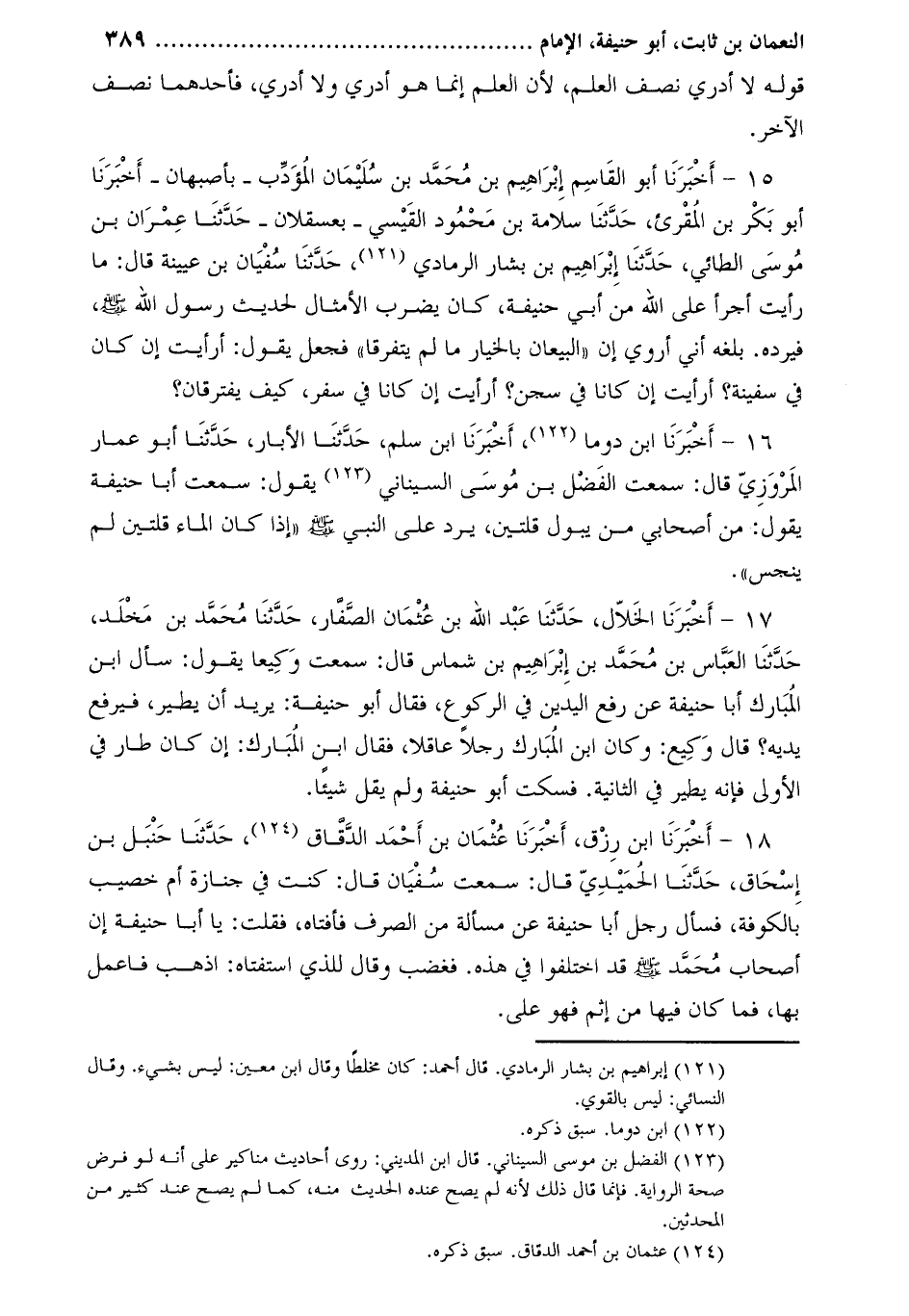 17- أَخْبَرَنَا الخلال، حدّثنا عبد الله بن عثمان الصّفّار، حدّثنا محمّد بن مخلد، حدّثنا العبّاس بن محمّد بن إبراهيم بن شماس قال: سمعت وكيعا يقول: سأل ابن المبارك أبا حنيفة عن رفع اليدين في الركوع، فقال أَبُو حنيفة: يريد أن يطير، فيرفع يديه؟ قال وكيع: وكان ابن المبارك رجلا عاقلا، فقال ابن المبارك: إن كان طار في الأولى فإنه يطير في الثانية. فسكت أَبُو حنيفة ولم يقل شيئا.