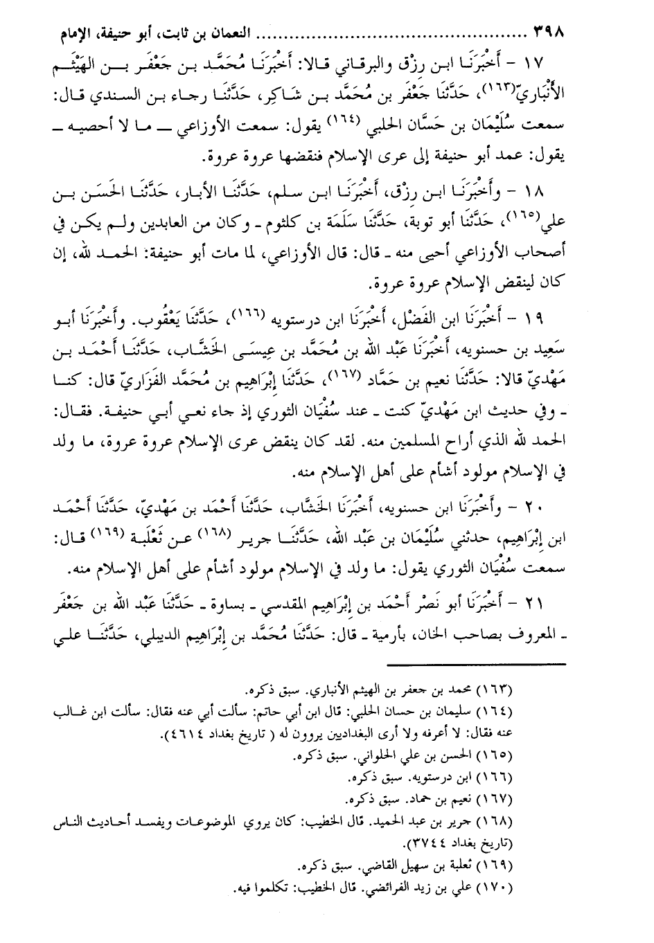 18- وأَخْبَرَنَا ابن رزق، أخبرنا ابن سلم، حدّثنا الأبار، حدّثنا الحسن بن علي [3] ، حدّثنا أبو توبة، حَدَّثَنَا سلمة بن كلثوم- وكان من العابدين ولم يكن في أصحاب الأوزاعي أحيا منه- قال: قال الأوزاعي، لما مات أَبُو حنيفة: الحمد لله، إن كان لينقض الإسلام عروة عروة.