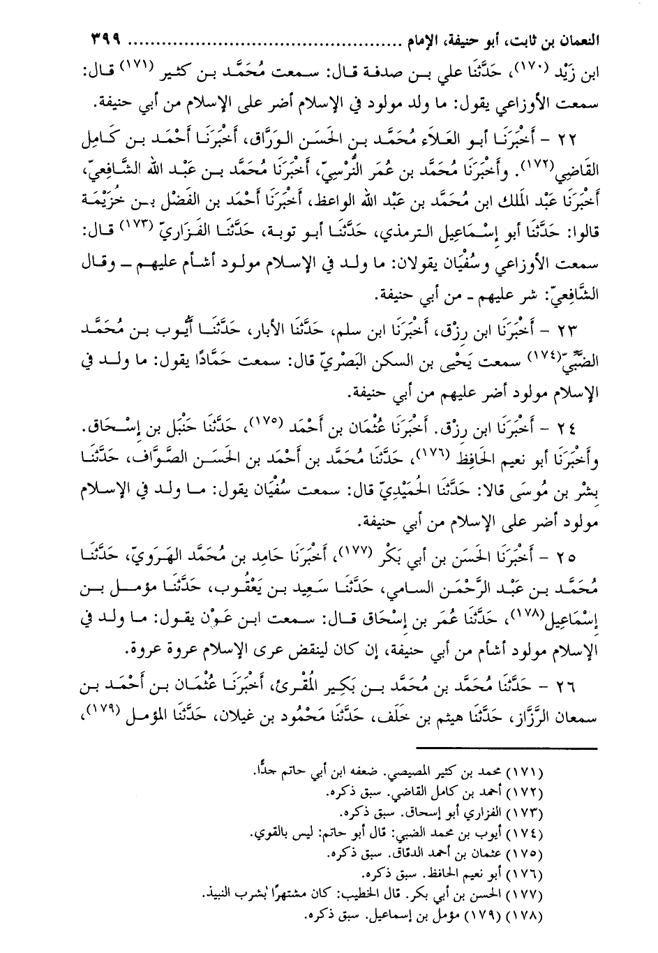 25- أخبرنا الحسن بن أبي بكر [8] ، أخبرنا حامد بن محمّد الهرويّ، حدّثنا محمّد بن عبد الرّحمن السامي، حدّثنا سعيد بن يعقوب، حدّثنا مؤمل بن إسماعيل [9] ، حَدَّثَنَا عُمَر بن إسحاق قال: سمعت ابن عون يقول: ما ولد في الإسلام مولود أشأم من أبي حنيفة، إن كان لينقض عرى الإسلام عروة عروة.