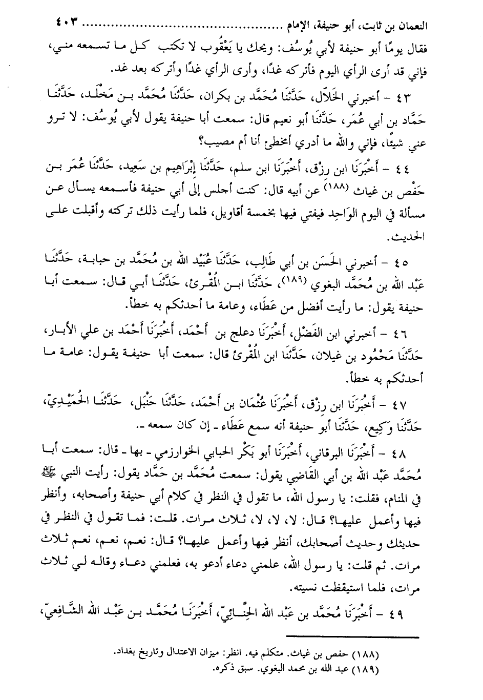 43- أخبرني الخلّال، حدّثنا محمّد بن بكران، حدّثنا محمّد بن مخلد، حدّثنا حمّاد بن أبي عمر، حَدَّثَنَا أَبُو نعيم قال: سمعت أبا حنيفة يقول لأبي يوسف: لا ترو عني شيئا، فإني والله ما أدري أمخطئ أنا أم مصيب؟