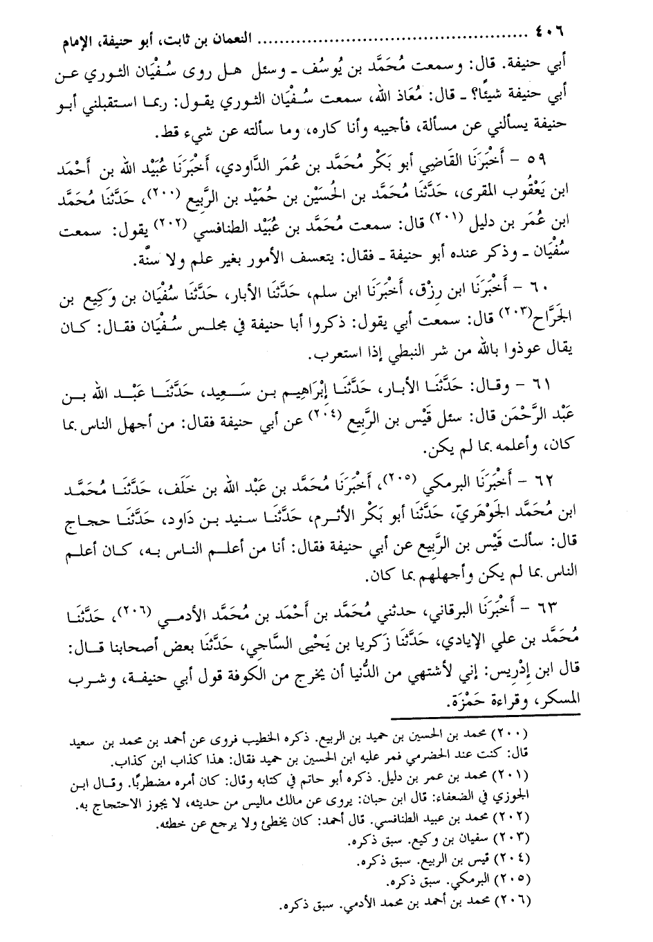 59- أَخْبَرَنَا الْقَاضِي أَبُو بَكْر مُحَمَّد بْن عُمَر الدّاودي، أَخْبَرَنَا عُبَيْدُ اللَّهِ بْنُ أَحْمَدَ ابْنِ يَعْقُوبَ المقري، حَدَّثَنَا مُحَمَّد بْن الحسين بْن حميد بْن الربيع [1] ، حدّثنا محمّد ابن عمر بن دليل [2] قال: سمعت مُحَمَّد بن عبيد الطنافسي [3] يقول: سمعت سفيان- وذكر عنده أَبُو حنيفة- فقال: يتعسف الأمور بغير علم ولا سنة.