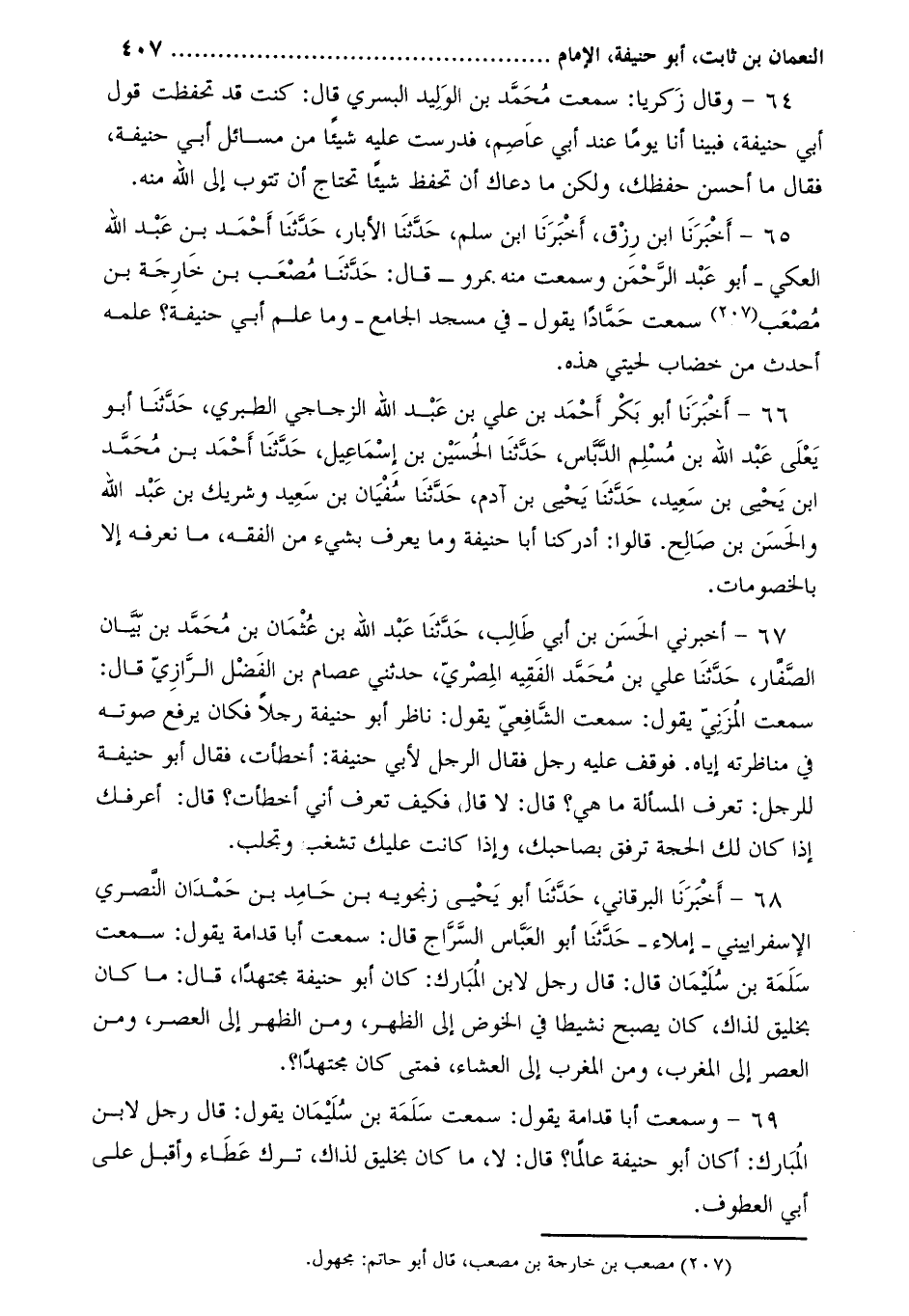 65- أَخْبَرَنَا ابن رزق، أخبرنا ابن سلم، حدّثنا الأبار، حدّثنا أحمد بن عبد الله العكي- أَبُو عَبْد الرَّحْمَن وسمعت منه بمرو- قَالَ: حَدَّثَنَا مصعب بن خارجة بن مصعب [1] سمعت حمادا يقول- في مسجد الجامع- وما علم أبي حنيفة؟ علمه أحدث من خضاب لحيتي هذه.