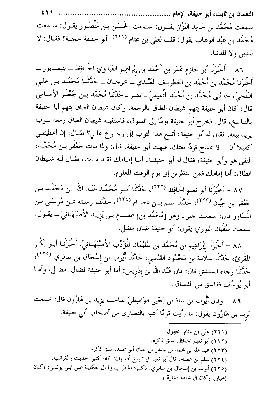 86- أَخْبَرَنَا أَبُو حازم عُمَر بن أَحْمَد بْنُ إبراهيم العبدوي الحافظ- بنيسابور- أَخْبَرَنَا مُحَمَّد بْن أَحْمَد بْن الغطريف العبدي- بجرجان- حدّثنا محمّد بن علي البلخيّ، حدثني محمّد بن أحمد التّميميّ- بمصر- حَدَّثَنَا مُحَمَّد بن جعفر الأسامي قال: كان أَبُو حنيفة يتهم شيطان الطاق بالرجعة، وكان شيطان الطاق يتهم أبا حنيفة بالتناسخ، قال: فخرج أَبُو حنيفة يوما إلى السوق، فاستقبله شيطان الطاق ومعه ثوب يريد بيعه. فقال له أَبُو حنيفة: أتبيع هذا الثوب إلى رجوع علي؟ فقال: إن أعطيتني كفيلا أن لا تمسخ قردا بعتك، فبهت أَبُو حنيفة. قال: ولما مات جعفر بن مُحَمَّد، التقى هو وأبو حنيفة، فقال له أَبُو حنيفة: أما إمامك فقد مات، فقال له شيطان الطاق: أما إمامك فمن المنظرين إلى يوم الوقت المعلوم.