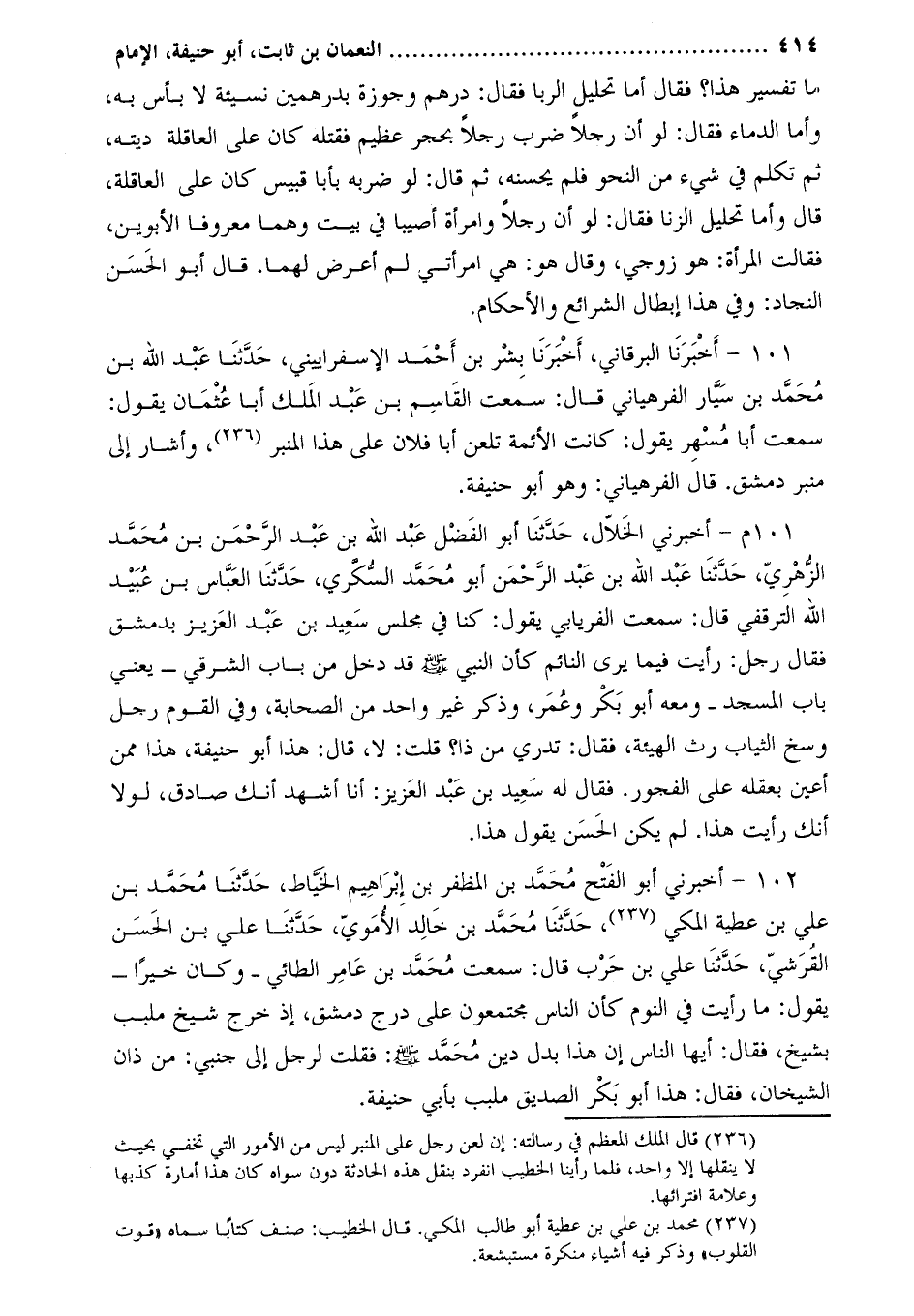 101 م- أخبرني الخلّال، حدّثنا أبو الفضل عَبْدُ اللَّهِ بْنُ عَبْدِ الرَّحْمَنِ بْنِ مُحَمَّدٍ الزُّهْرِيُّ، حدّثنا عبد الله بن عَبْد الرَّحْمَن أَبُو مُحَمَّد السكري، حَدَّثَنَا العباس بن عبيد الله الترقفي قال: سمعت الفريابي يقول: كنا في مجلس سعيد بن عبد العزيز بدمشق فقال رجل: رأيت فيما يرى النائم كأَنَّ النَّبِيَّ صَلَّى اللَّهُ عَلَيْهِ وَسَلَّمَ قد دخل من باب الشرقي- يعني باب المسجد- ومعه أَبُو بكر وعمر، وذكر غير واحد من الصحابة، وفي القوم رجل وسخ الثياب رث الهيئة، فقال: تدري من ذا؟ قلت: لا، قال: هذا أَبُو حنيفة، هذا ممن أعين بعقله على الفجور. فقال له سعيد بن عبد العزيز: أنا أشهد أنك صادق، لولا أنك رأيت هذا. لم يكن الحسن يقول هذا.