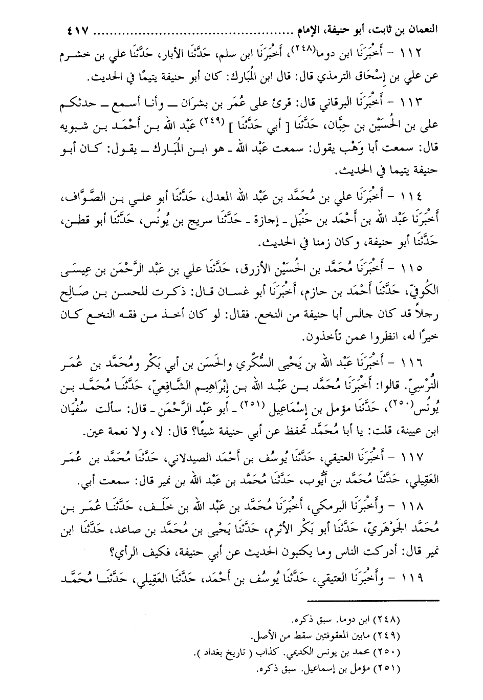 113- أَخْبَرَنَا الْبَرْقَانِيّ قال: قرئ على عمر بن بشران- وأنا أسمع- حدثكم عَليّ بن الحُسَيْن بن حبان، حدّثنا [أبي حَدَّثَنَا] [2] عَبْد اللَّه بْن أَحْمَد بْن شَبَّوَيْهِ قَالَ: سَمِعْتُ أَبَا وَهْب يَقُولُ: سَمِعْتُ عَبْد الله- هُوَ ابن المبارك- يَقُولُ: كَانَ أَبُو حنيفة يتيما في الحديث.