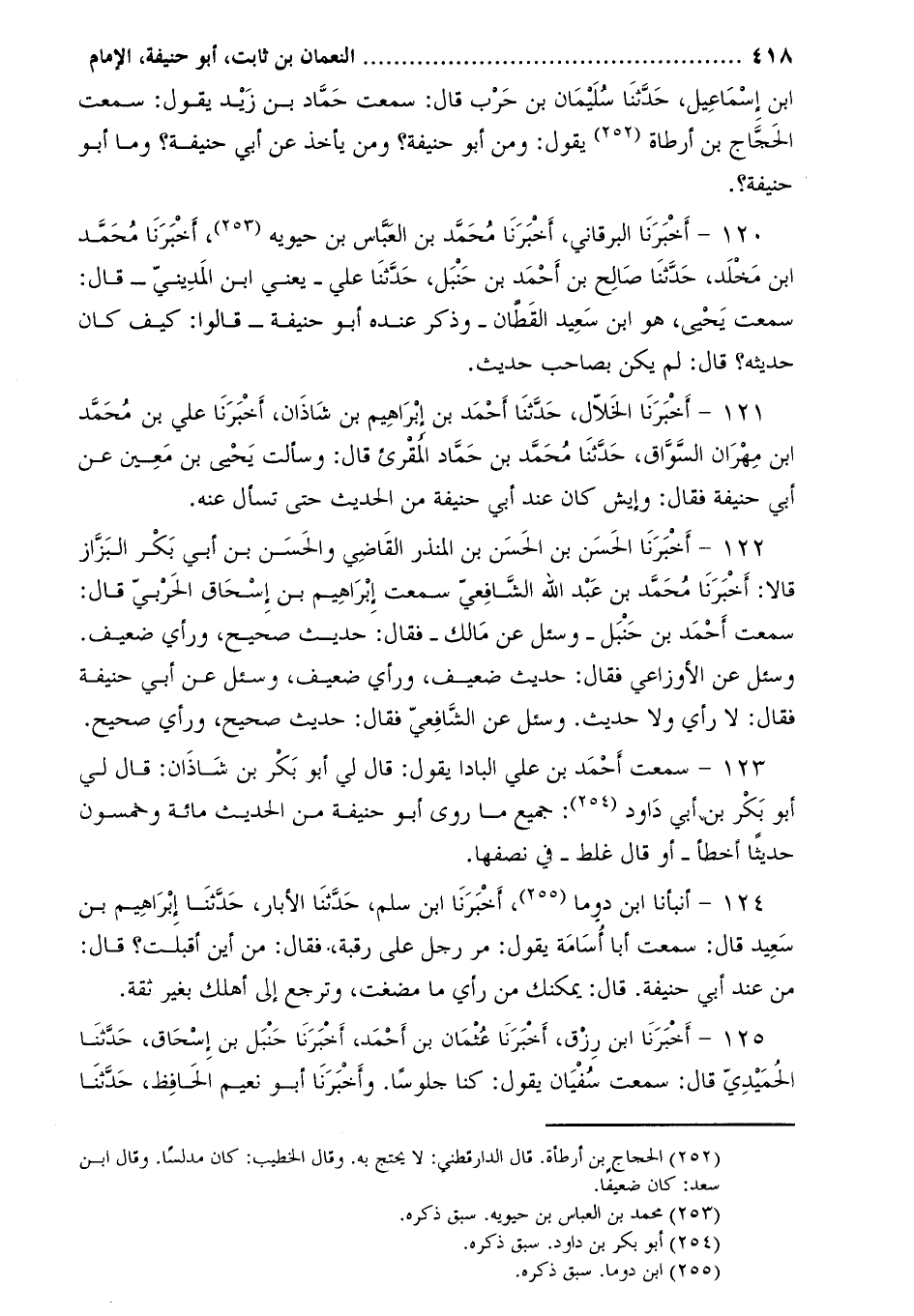 121- أخبرنا الخلّال، حدّثنا أحمد بن إبراهيم بن شاذان، أخبرنا علي بن محمّد ابن مهران السّوّاق، حَدَّثَنَا مُحَمَّد بن حَمَّاد المُقْرِئ قَالَ: وسألت يَحْيَى بْن معين عَنْ أَبِي حنيفة فَقَالَ: وأيش كَانَ عند أَبِي حنيفة من الحديث حَتَّى تسأل عَنْهُ.